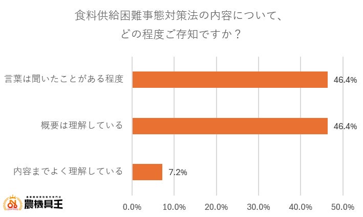 食料供給困難事態対策法を知る農家の46.4%が「言葉を聞いたことがある」または「概要を理解」と回答し、「内容をよく理解している」は7.2%にとどまり、詳細を理解する農家はごく少数でした。