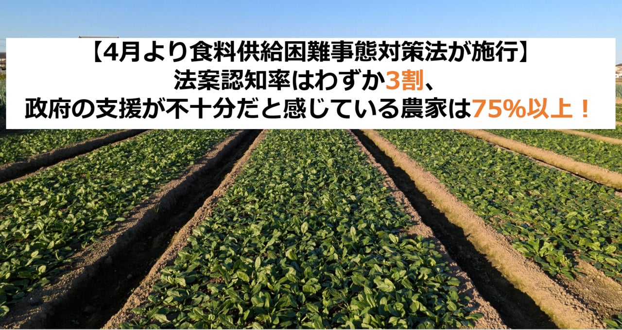 【4月より食料供給困難事態対策法が施行】法案認知率はわずか3割、政府の支援が不十分だと感じている農家は75%以上!