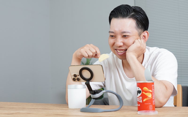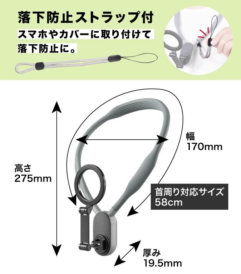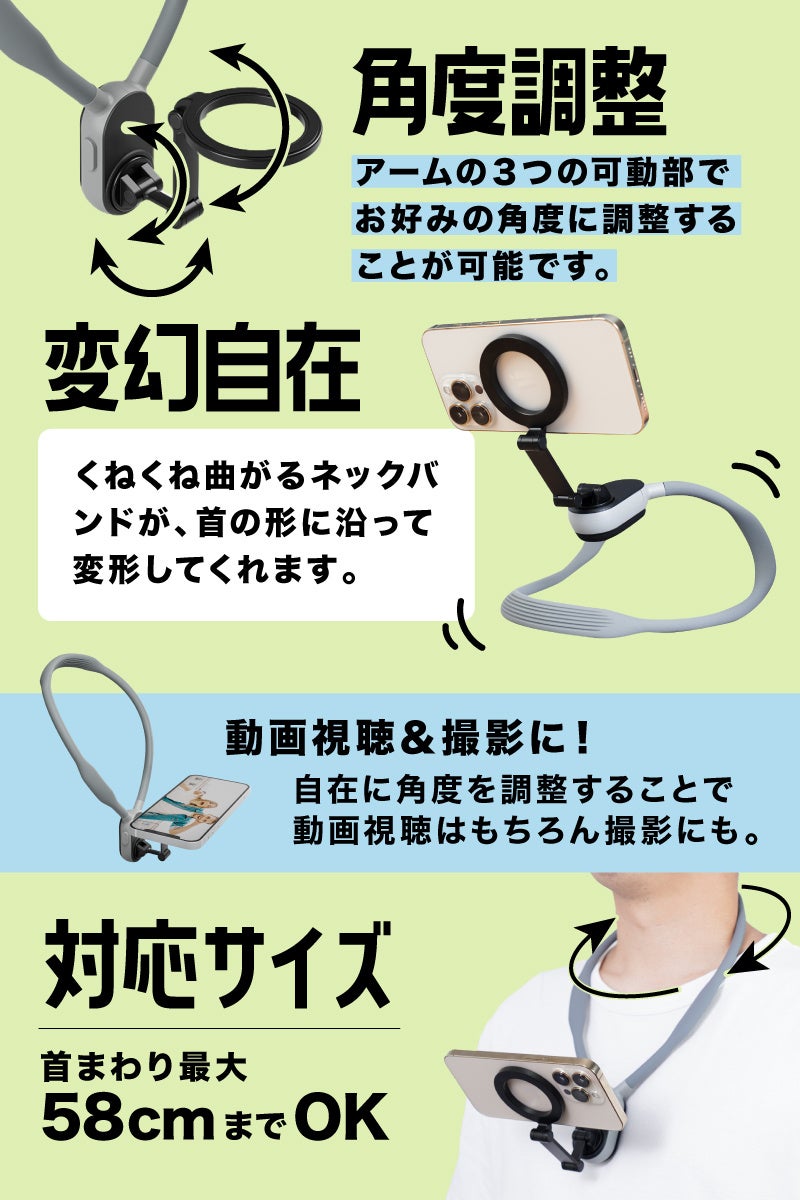 首に巻いて使用。首回り最大58cmまで対応。くねくねと曲がる首掛け部分の先端にホルダーを搭載。ホルダー部から2軸のアームが伸びその先にマグセーフ用リングを搭載。マグセーフ対応スマホに磁石でしっかりと固定します。マグセーフ非対応のスマホでも付属のマグネットを張り付ければ使用可能。ネックバンド部分はボタンで簡単に脱着が可能。くねくねと曲がるネックバンドを工夫すれば、卓上に置いてスマホスタンドとしても使えます。