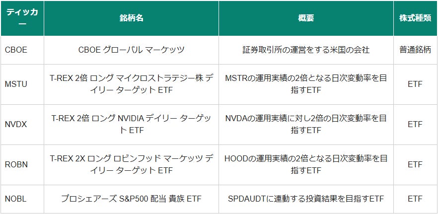 ※当社取扱29銘柄のうち、売買代金上位5銘柄を掲載。売買代金はCboe公式HP2025年6月9日データより当社にて概算値を算出。https://www.cboe.com/us/equities/market_statistics/listed_symbols/