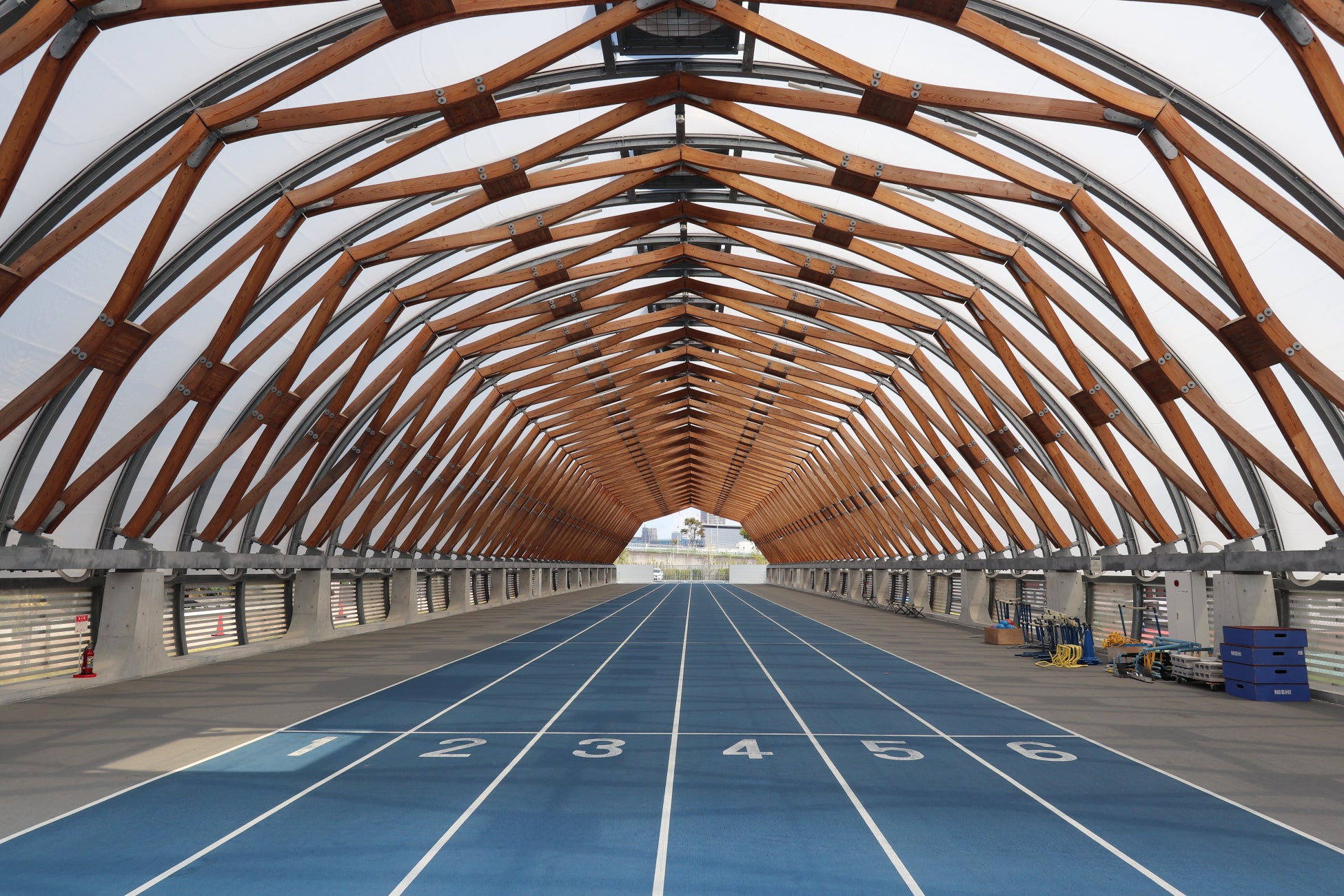木質アーチの全長約100mのトンネル状の構造内部に90mのトラックを6レーン設けた全天候型ランニング練習場です。スポーツの利用を念頭に置いて、車椅子でも利用できるバリアフリー構造となっています