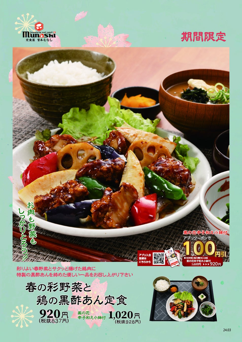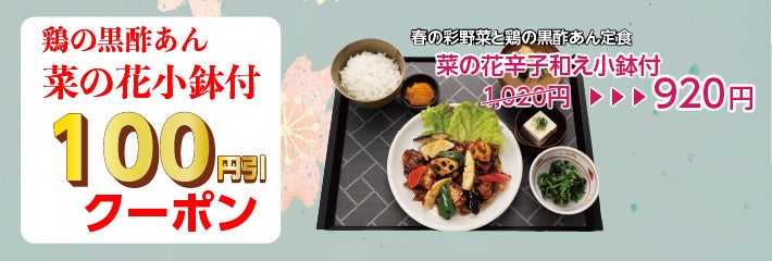 宮本むなし公式アプリでは、販売期間中に何度でも使える「春の彩野菜と鶏の黒酢あん定食(菜の花辛子和え小鉢付)100円引きクーポン」を配信いたします。会員の方限定でご利用いただけるクーポンですので、この機会にぜひ宮本むなし公式アプリをダウンロード&会員登録ください。