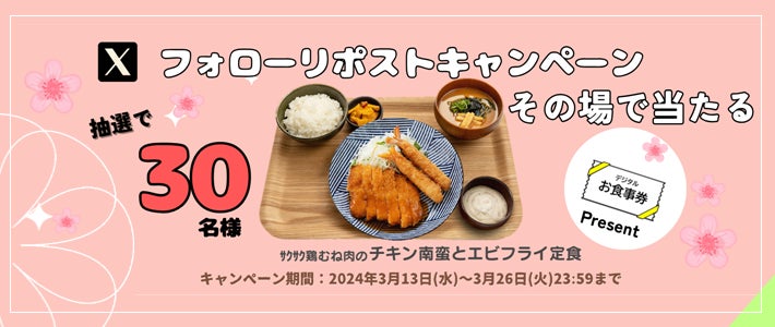 あわせて、2024年3月13日(水)~2024年3月26日(火)の期間に「宮本むなし公式Xフォロー&リポストキャンペーン」を実施いたします。宮本むなしの公式Xアカウントをフォローし、キャンペーン投稿をリポすることで応募でき、その場での抽選で30名様に、定食屋むなし店内で「サクサク鶏むね肉のチキン南蛮とエビフライ定食(980円税込み)」1人前をお召し上がりいただけるデジタルお食事券が当たるキャンペーンです。