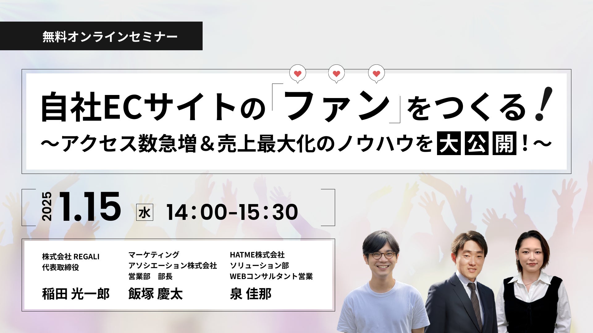 マーケティングアソシエーション株式会社の子会社であるHATME株式会社(本社:東京都台東区 代表取締役:中園広和、以下当社)は2025年1月15日(水)に、株式会社REGALI、マーケティングアソシエーション株式会社との4社共催ウェブセミナー「自社ECサイトのファンをつくる!~アクセス数急増&売上最大化のノウハウを大公開!~」を、開催いたします。