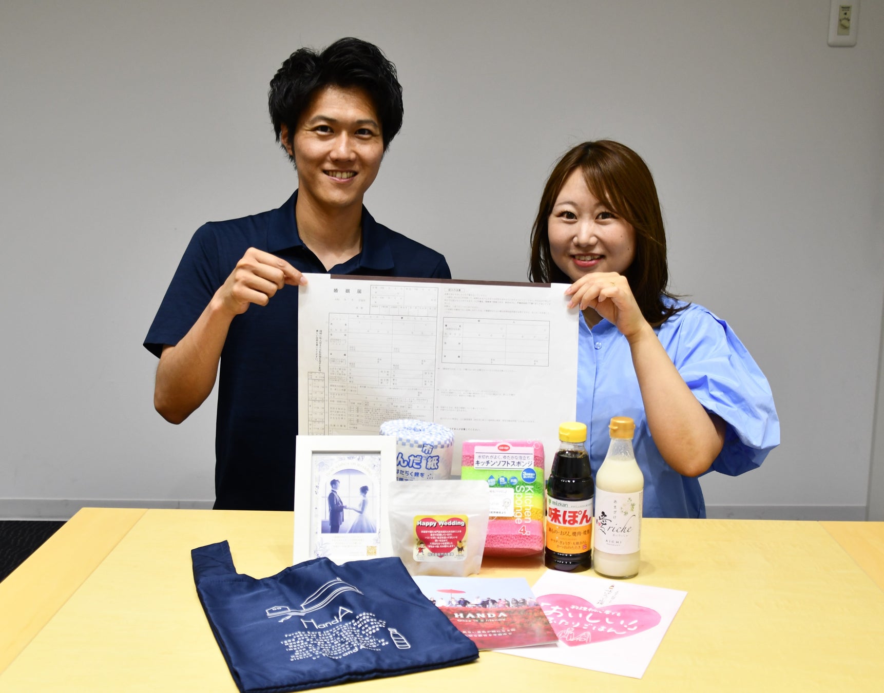 半田市では婚姻届提出者にお祝い品を提供してきましたが、これまで本籍地以外の市区町村に戸籍の届出(婚姻届、離婚届等)を行う際に必要だった戸籍謄本が3月の法改正により原則不要になり、日本全国どこでも手間なく提出できるようになったことを受け、お祝い品をよりパワーアップしてきました。昨年10月からは県内最多提供数となる合計7品をお祝い品としてプレゼントしています。