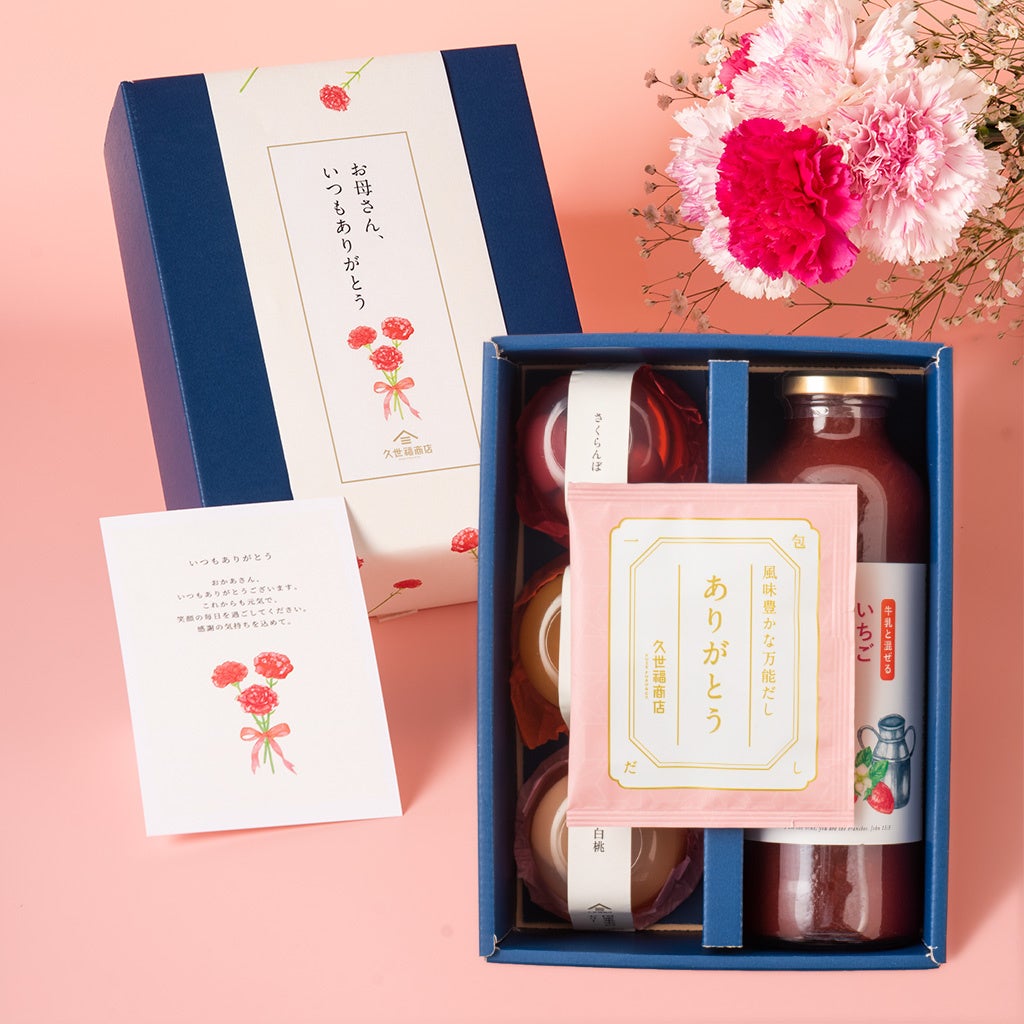 初夏にぴったりな「国産果実のゼリー」と「いちごミルクの素」に、感謝の気持ちが伝わる、ありがとうのメッセージ入り「風味豊かな万能だし(一包)」を添えた、まさに母の日にぴったりな贈り物です。