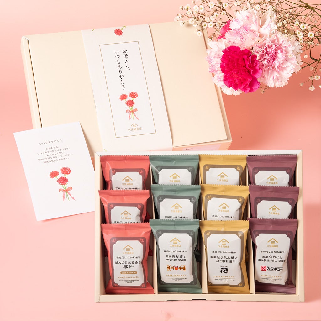 毎日の朝食に重宝するフリーズドライの味噌汁の詰め合わせ。久世福のだしを使った4種類の味噌汁をお楽しみいただけます。