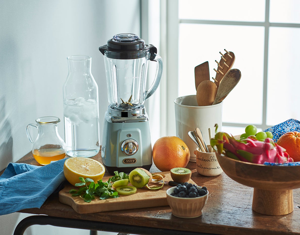 カラーは「ペールアクア」と「アッシュホワイト」の2色展開。メタリックなデザインを取り入れたレトロスタイルで、インテリアのアクセントにもなるブレンダーです。