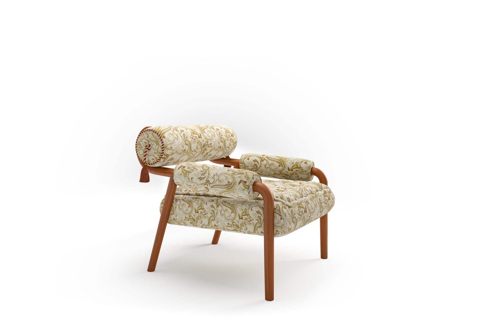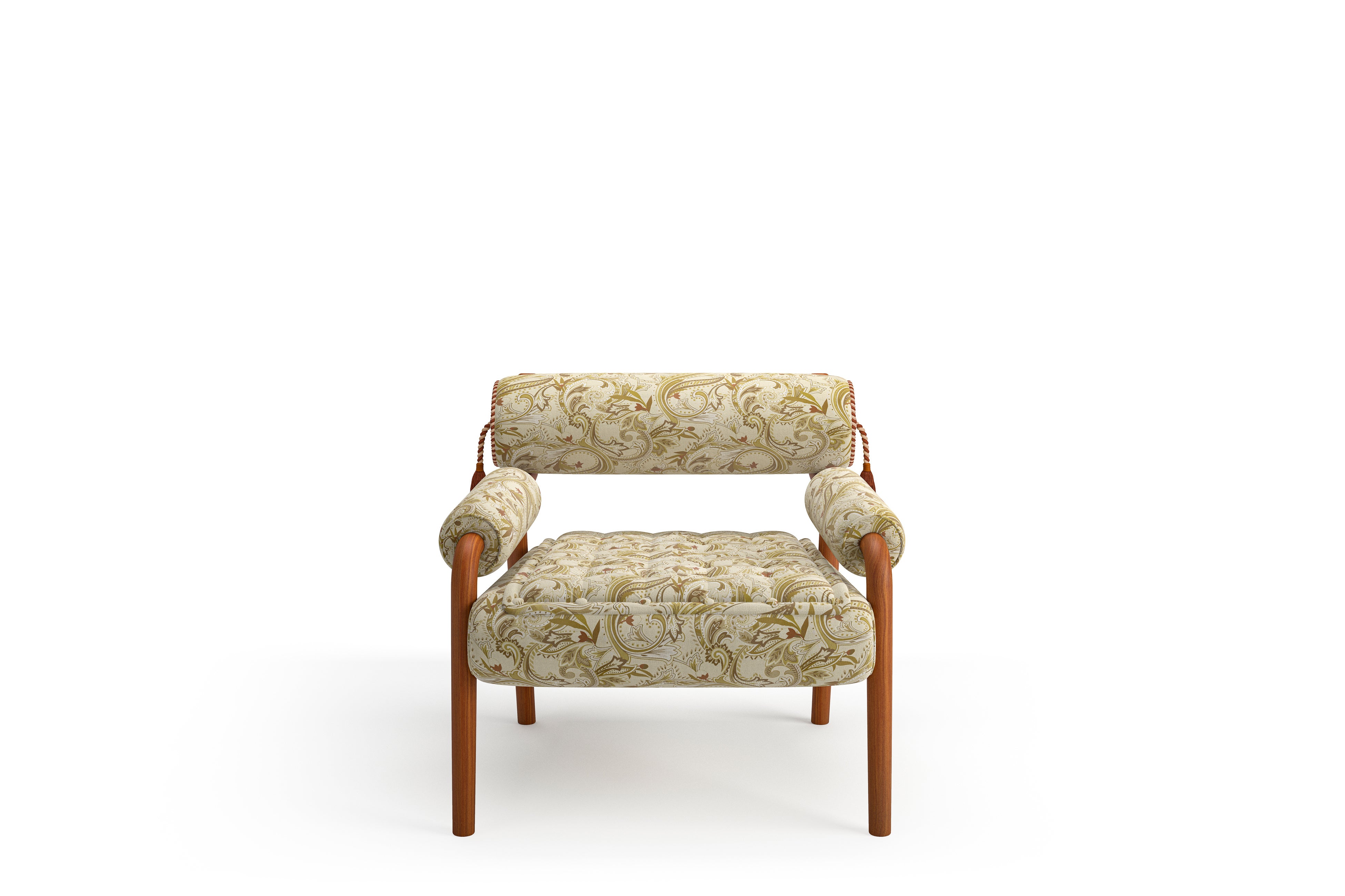 シートには、クラシックなカピトネ(ボタン留め)を現代的に再解釈した仕様を採用し、アームレストとバックレストには布張りのロールクッションを用いることで、構築的なフォルムと包み込まれるような座り心地を両立。サイドに施されたパスマントリー(装飾ブレード)や繊細なタッセルが、視覚的なリズムと豊かな触感をもたらします。装飾は単なる意匠に留まらず、構造そのものに組み込まれた表現として昇華され、エトロならではのクラフツマンシップとストーリー性が息づいています。