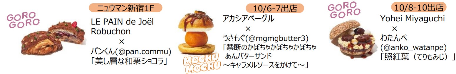 都内の人気ベーカリー「アカシアベーグル」、「GARDEN HOUSE CRAFTS」、「Yohei Miyaguchi」と、ニュウマン新宿内のベーカリー計6ショップが、パン好きインフルエンサーとコラボレーション!「秋の味覚のオノマトペ」をテーマにパンまつり限定のコラボパンを展開します。