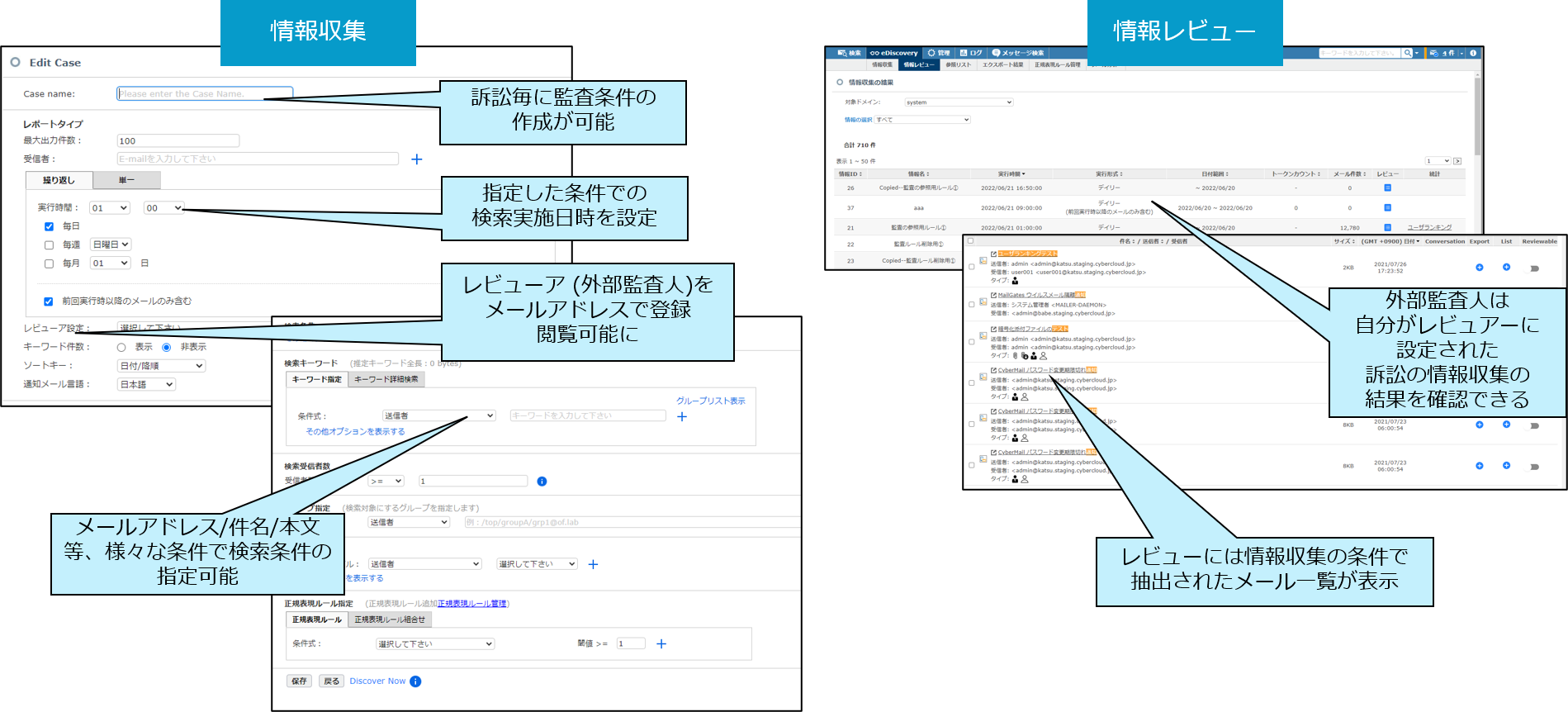 『Enterprise Audit』は、『MailBase』の機能をベースに、eDiscovery(※2)を行う際の手順であるEDRM(電子情報開示参考モデル)のフローに従い、監査業務を迅速かつ正確に行うための機能をさらに強化しました。