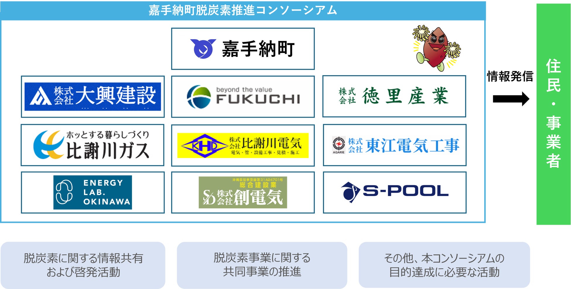 一方、嘉手納町は、気候変動対策の一環として、コンパクトな町の特性を活かした持続可能なまちづくりを推進し、再生可能エネルギーの活用や省エネルギー対策の強化に取り組んでいます。しかし、脱炭素化の実現には、 民間企業との連携による具体的な施策の推進が不可欠であることから、官民が協働し、より実効性の高い取り 組みを進めるため、本コンソーシアムを設立しました。