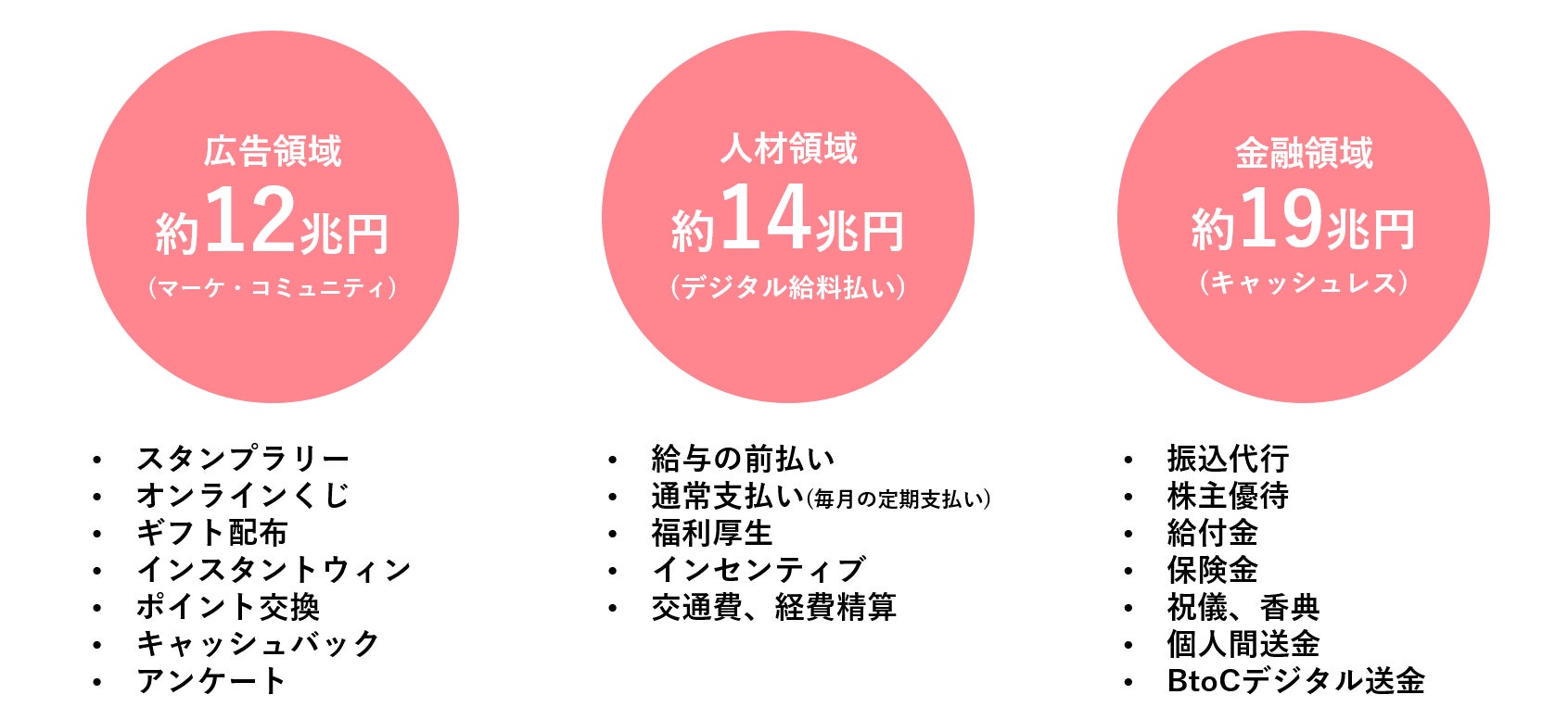 マーケティング(広告)領域・人材領域・支払いのDX(金融)領域の3つの領域を注力領域としてあげ、3万円以下のtoC向け支払いでのシェア拡大を目指し邁進しております。
