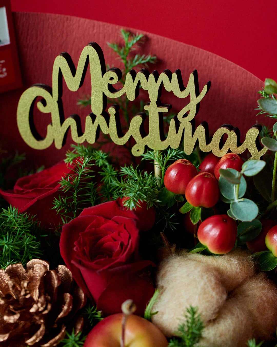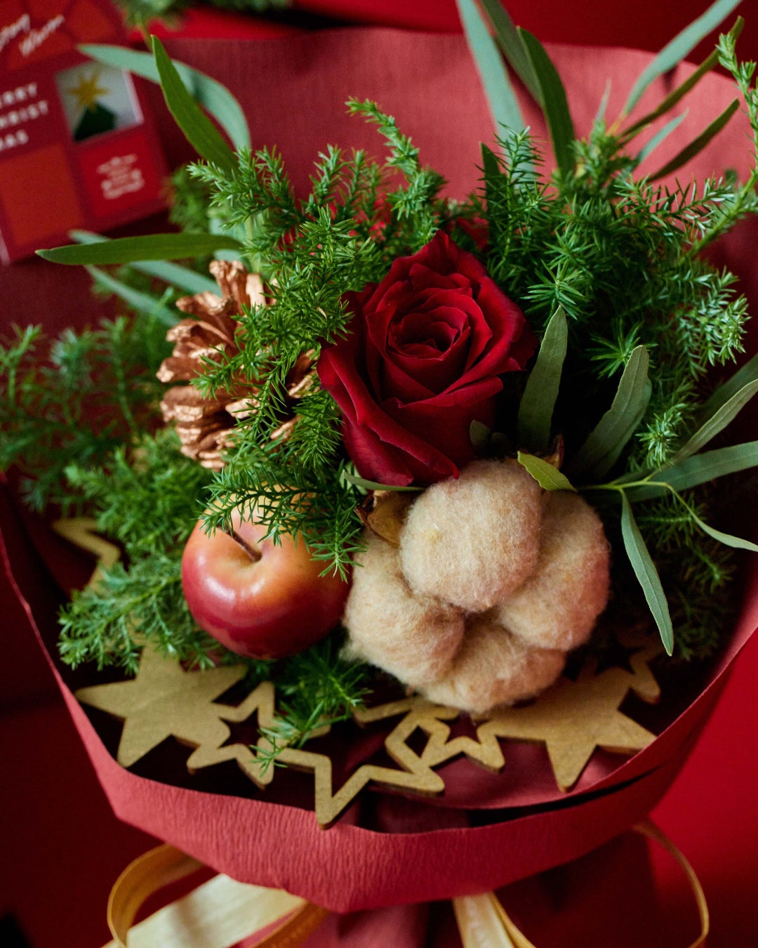 ボリュームたっぷりの針葉樹とコットンや姫りんごなどを合わせた、心ときめくクリスマスブーケ。大きいサイズのメリーは、バラとカーネーションを贅沢に束ね、コットンや可愛らしいフルーツ、ゴールドのピックでゴージャス&華やかに仕上げています。小さいサイズのスターリーは、キュートなサイズでも存在感があります。