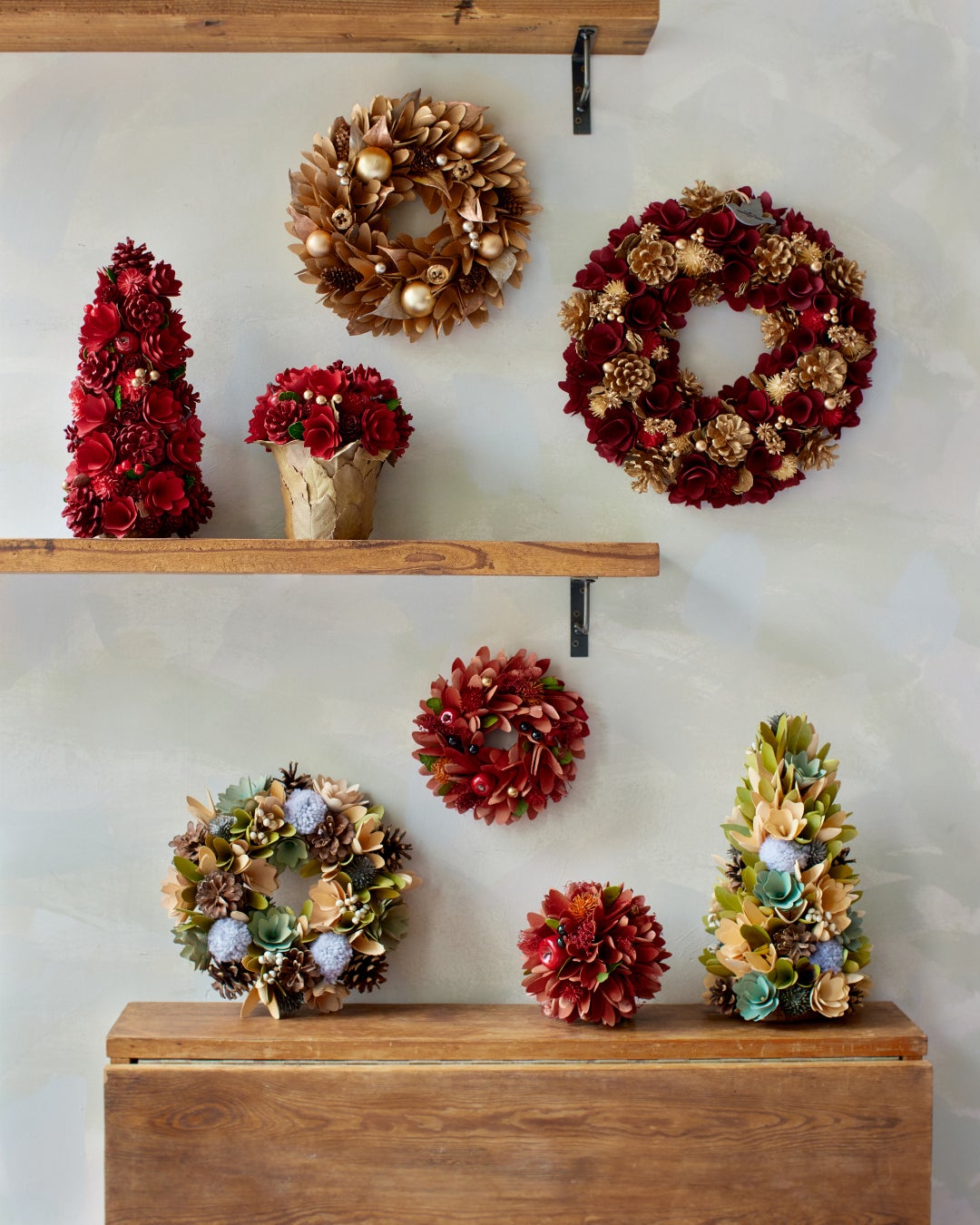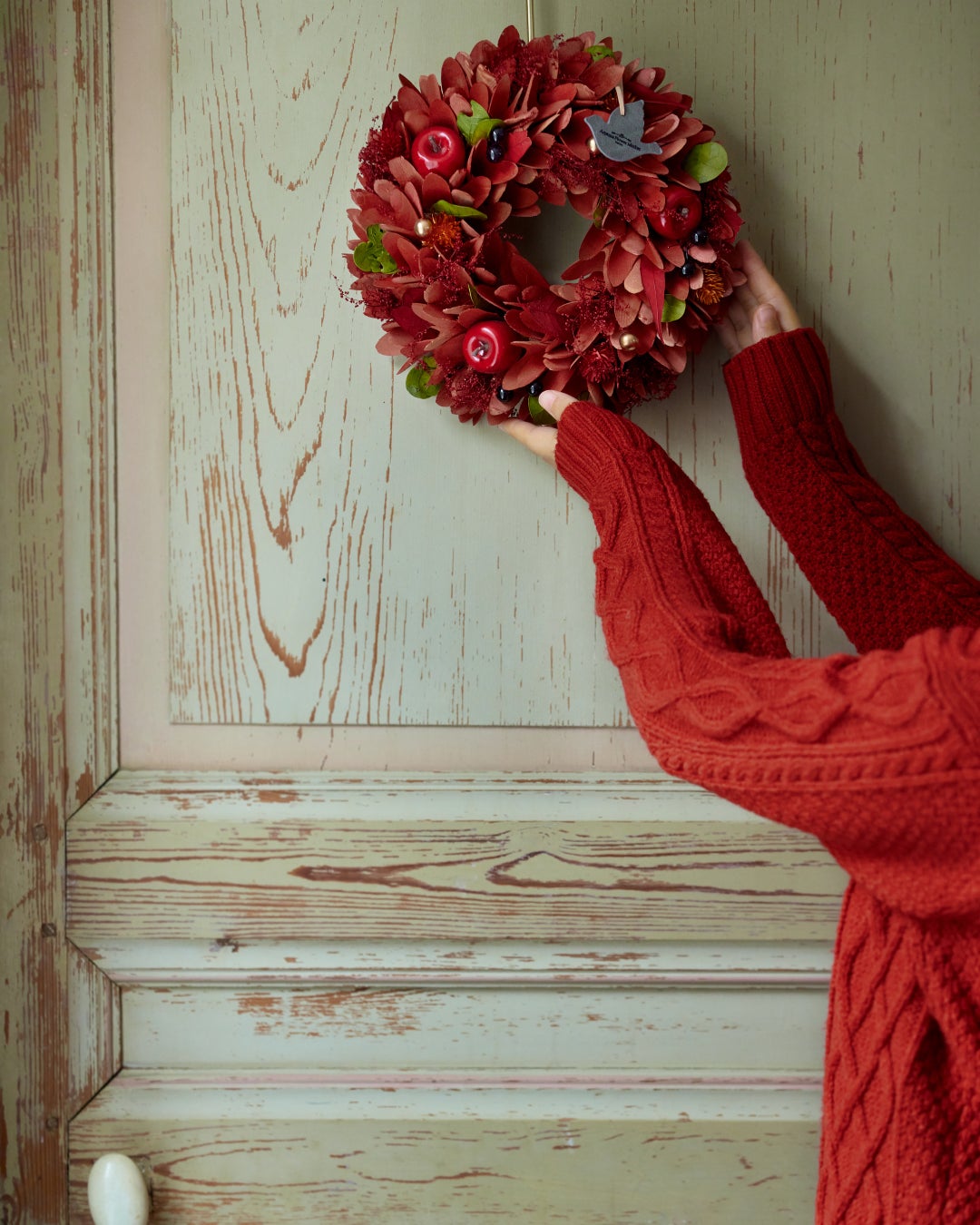 終わりのない形が「永遠の幸福」を象徴するリース。自然素材をふんだんにあしらった、この時期ならではの仕上がりです。ドライなので、玄関やリビングなどに飾ればホリデーシーズンを長く彩ってくれます。