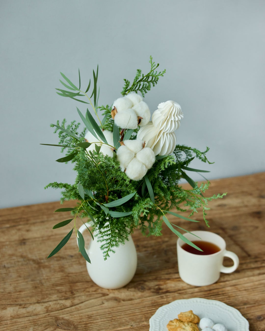 ホリデームードにぴったりな、あたたかみのあるフラワーアレンジメント