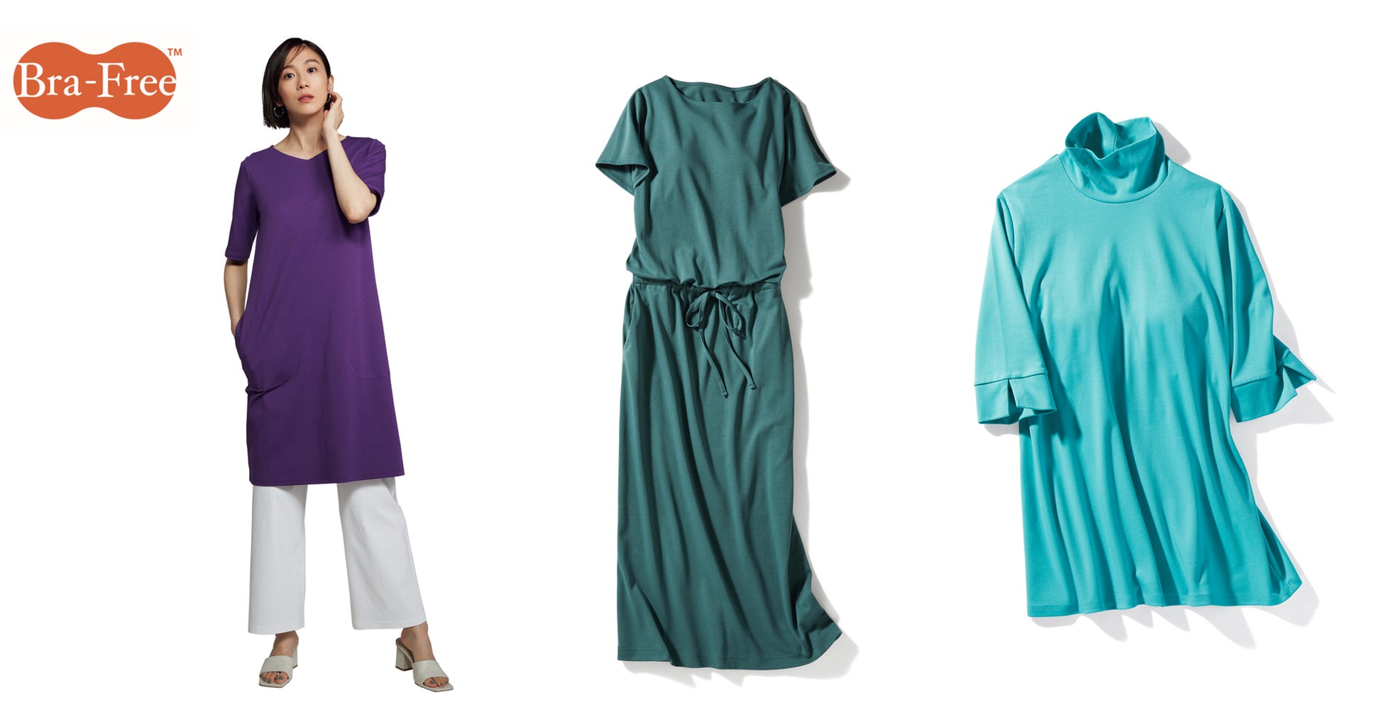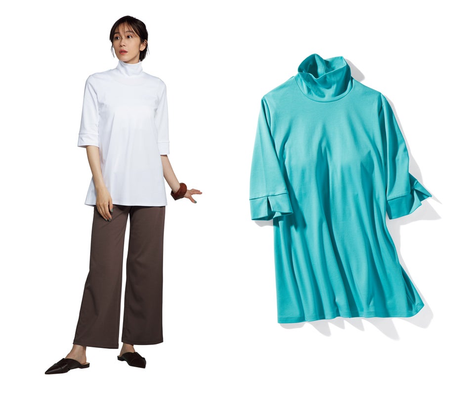 ホテルステイのお供としても大活躍するワンピース「ブラフリー・ボートネックTワンピース」、1枚できれいな胸元をつくる3種類のトップス「ブラフリー・浅Vネックチュニック」「ブラフリー・ボートネック6分袖」「ブラフリー・ハイネック6分袖」をご用意。さらに同素材のボトムスとして、体型を拾わずすっきり着こなせる超長綿・ワイドストレートパンツ」、長めトップスと相性の良い「超長綿・レギンス」をご用意しています。