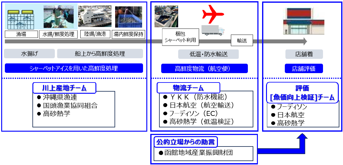 沖縄県国頭漁業協同組合、株式会社フーディソン、高砂熱学工業株式会社、日本航空株式会社、YKK株式会社、沖縄県漁業協同組合連合会、公益財団法人函館地域産業振興財団(北海道立工業技術センター)は、国頭漁協で獲れた鮮魚を、独自の冷却技術と新梱包材を活用した航空輸送を組み合わせ、魚の鮮度を科学的に評価する「K値」の考えに基づきお届けする「高鮮度輸送プロジェクト」(以下「本プロジェクト」)を始動します。