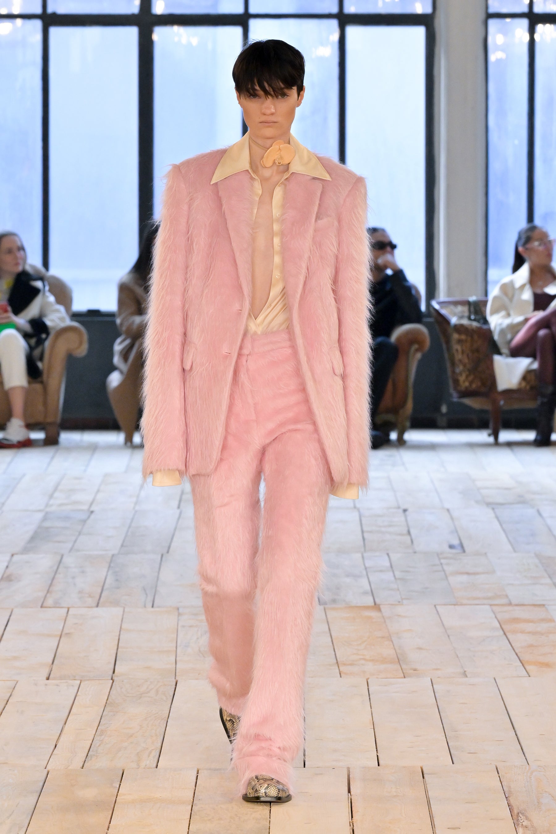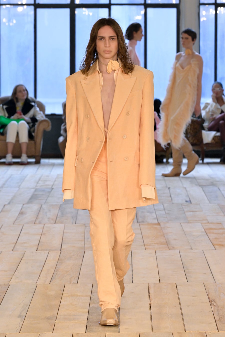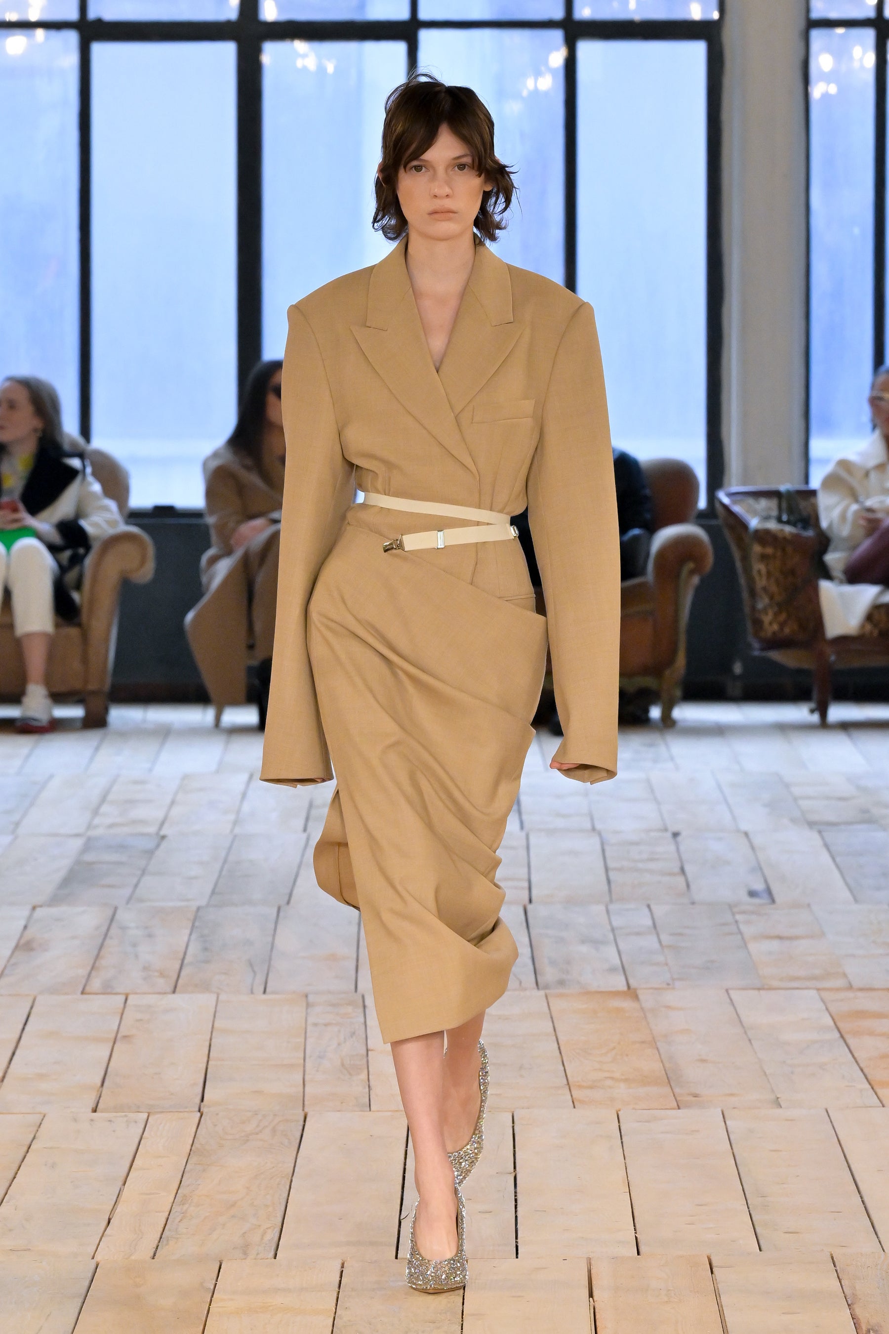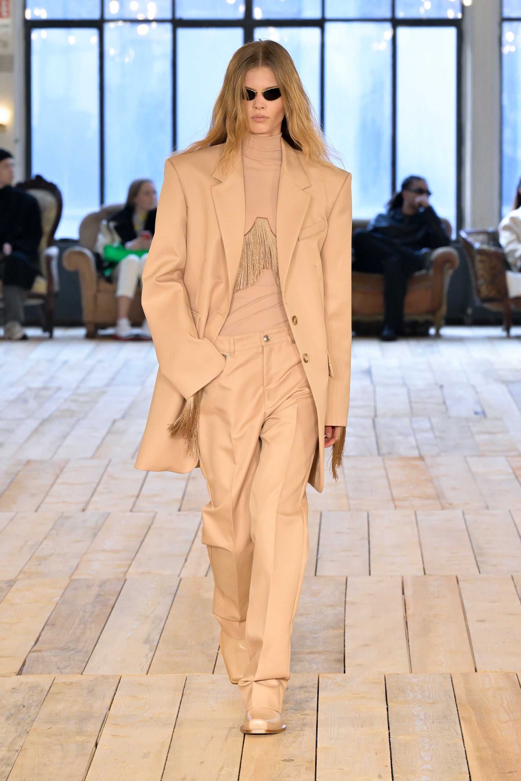 「BARE」は、そのタイトルが示唆するとおり、余分なものを取り除いて本質的要素を剥き出しにすることにより、物事の原点に立ち返るということです。覆い隠しつつさらけ出し、露わにしつつ覆い隠すこと。「BARE」は、根源的な呼び声、残忍なまでにシンプルな力、そして自然の中に見られる曖昧な官能性を称えるコレクションです。デザインには、純粋かつ野性的でありながら同時に、溢れ出るほどに過剰なマスキュリン/フェミニンなエネルギーが満ち、絶対的自由としての両性具有を表現しています。本コレクションは、ピーター・ヒュージャー、ロバート・メイプルソープ、ナン・ゴールディンなどの写真家の作品がインスピレーション源となっています。彼らはいずれも、しばしば陰に隠れた美しさを浮かび上がらせることに専念し、結果として、ハイアートと周辺的人生の間のパワフルな交差点となる作品を生み出しています。彼らのレンズを通して表現される人々は皆、肌と魂をむき出しにするという行為、つまり親密さと露出、魅力と退廃、脆弱性と鎧のような強固さの間の微妙な境界線上を永久に歩き続けるという行為に存在する難解な問題を、擬人化する存在となりました。ピーター・ヒュージャーはかつて、こう言っています。「私が写真に収めるのは、あらゆる極限まで自分を追い込む人たち。私が興味深いと感じる人たちはそういう人たちであり、自分自身でいるための自由に固執する人たちなのです。」この文脈で読み解くと「BARE」とは、単に「裸の状態」や「物事の純粋な状態」を表す言葉ではなく、むしろ、存在の複雑さを正当化することと同義であると言えます。つまり、ありきたりで決まりきったことを演じてみたかと思えば、型破りな行動を取ってみたり、一見奥深くあったかと思えば、非常に表面的であったり、ひとつの道にこだわったかと思えば、さまざまな改革を受け入れてみたり・・・こうした自由な意志があふれる存在の正当化です。何であろうと、裸になるということは、自分の肌に無条件に馴染むということです。自分らしくあるという行為は、それ自体が革命であり、自分の肌を讃えるということは、より一層パワフルな革命なのです。肌、すべての肌、第二の皮膚としての肌、すべてを讃えるのです。コレクションでは、ブルジョワなエレガンス、プリミティブなシックさ、そしてグラマラスな両性具有など、さまざまなコントラストが織りなすゲームのように展開していきます。伝統的なテーラリングを定義付けるのは、大胆なショルダーとワイドパンツ。ズートスーツとテディボーイズの両方をインスピレーションソースとするルックです。膝丈のストレートスカートと大胆なレイヤリングによって、90年代のドレスに見られた時代を超えた本質的な魅力が前面に押し出され、シアーで透明感のあるシルエットが活気を帯びて、ねじれたり回転したりしながら体を包み込みます。カラーパレットは、ニュートラルなスキントーンから、ベージュやキャメル、そしてシナモン、キャラメル、ジンジャーの色調のブラウンまで、幅広く展開。いずれも繊細なピーチで補われ、ときおり入る絶対的なブラックが全体を引き締めます。アクセサリーは、メタルとボタニカルなアクセントの意外な組み合わせによって生命が吹き込まれています。ランウェイショーは、ボロボロのソファが置かれたグランジガレージのような親密な空間が舞台。テオ・テアルドによる音楽「Stelle Disorientate」がショーを盛り上げます。