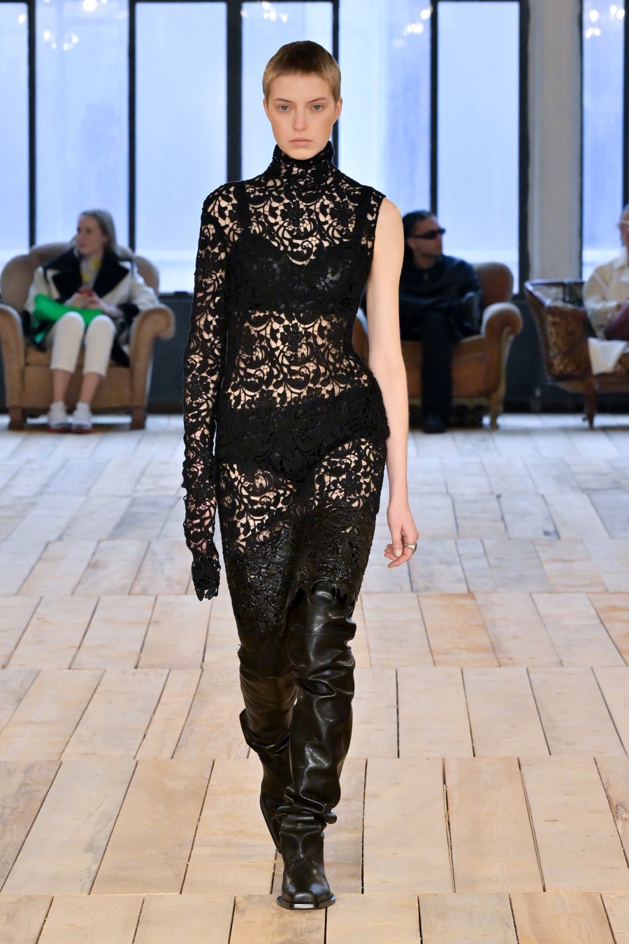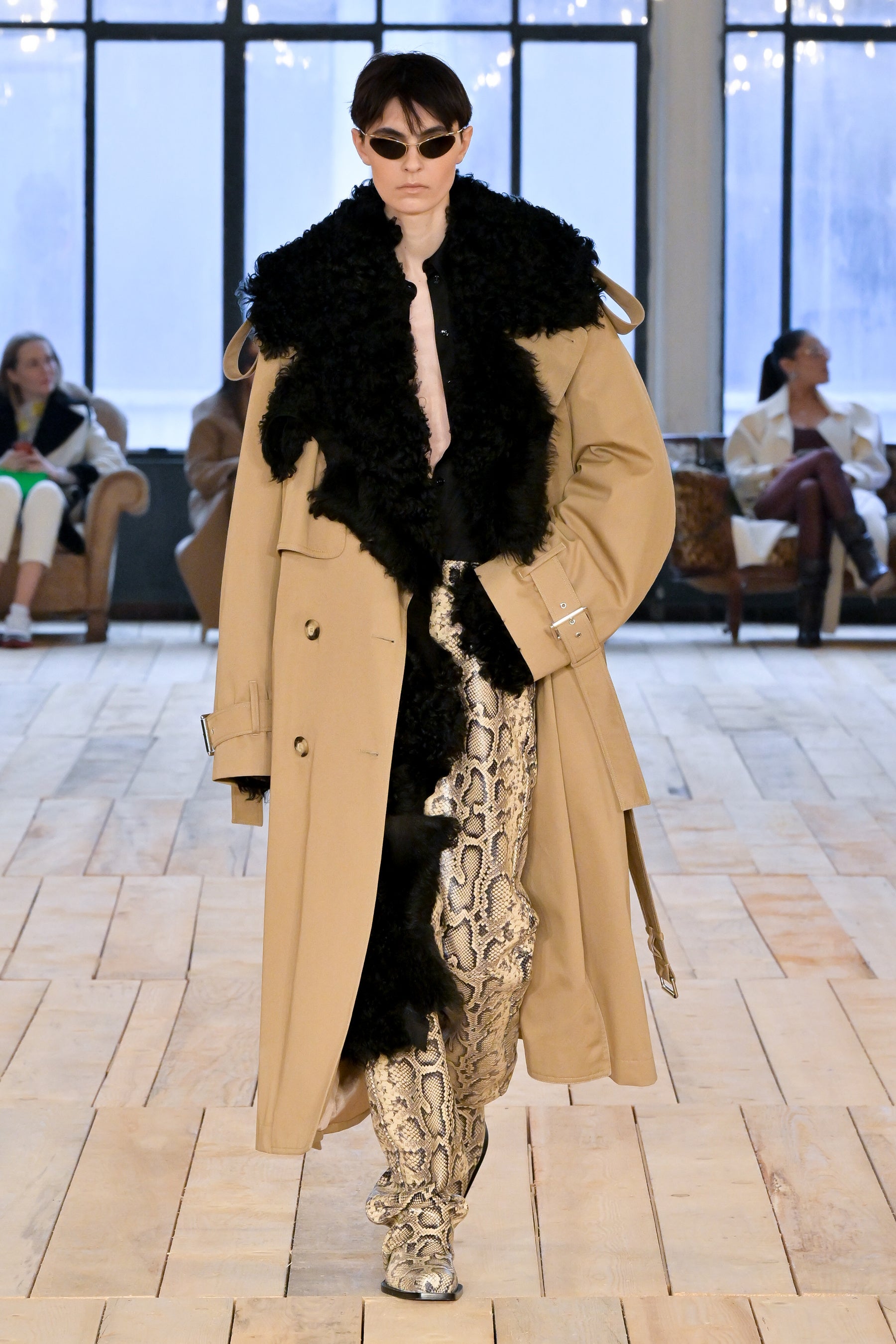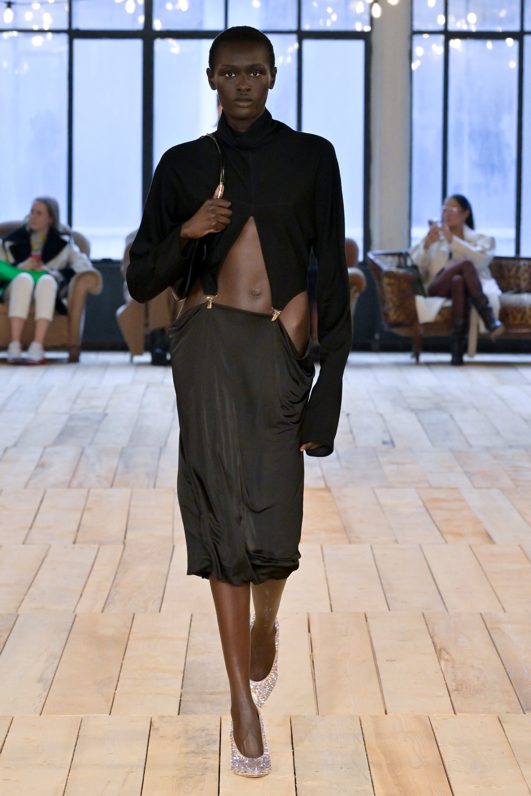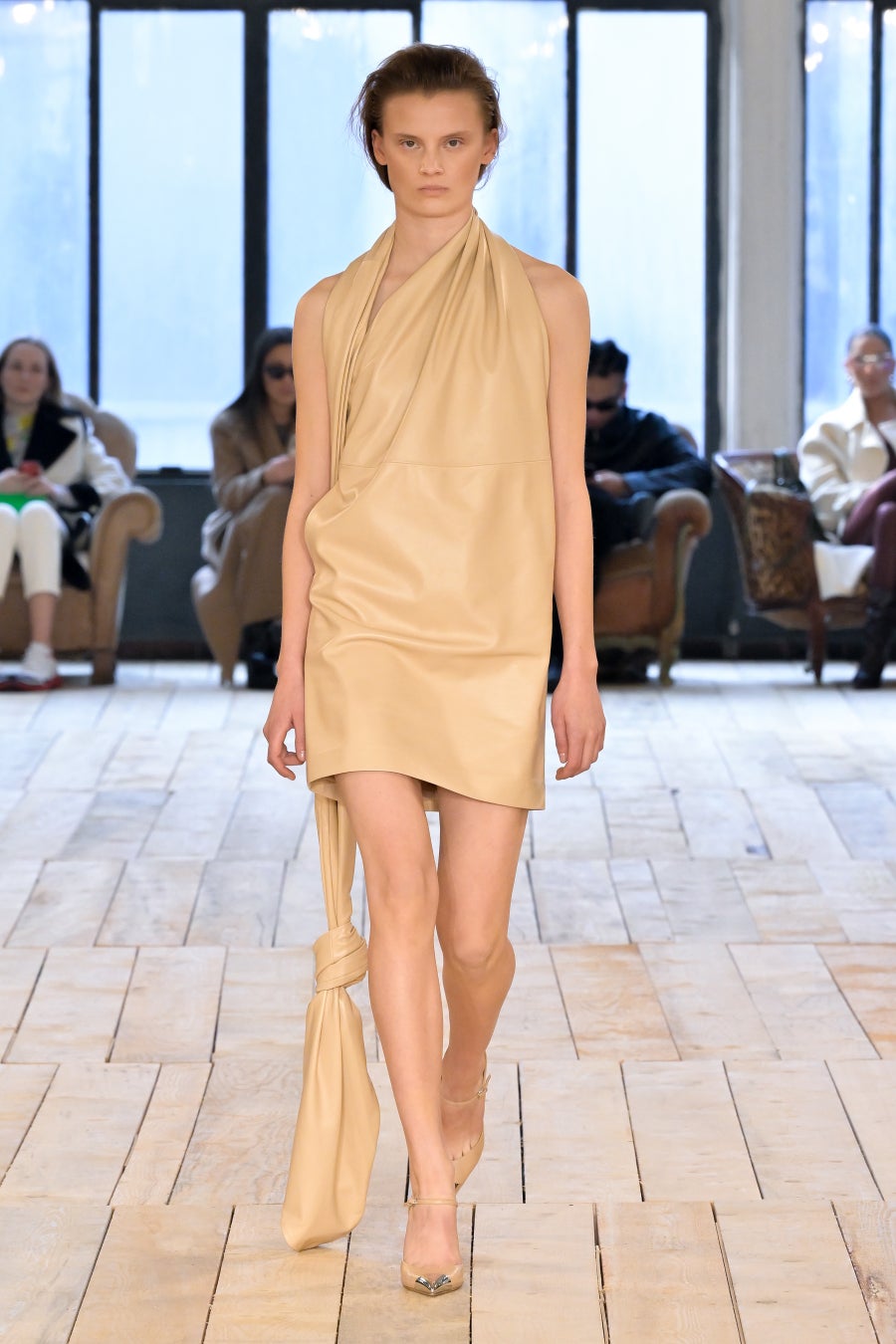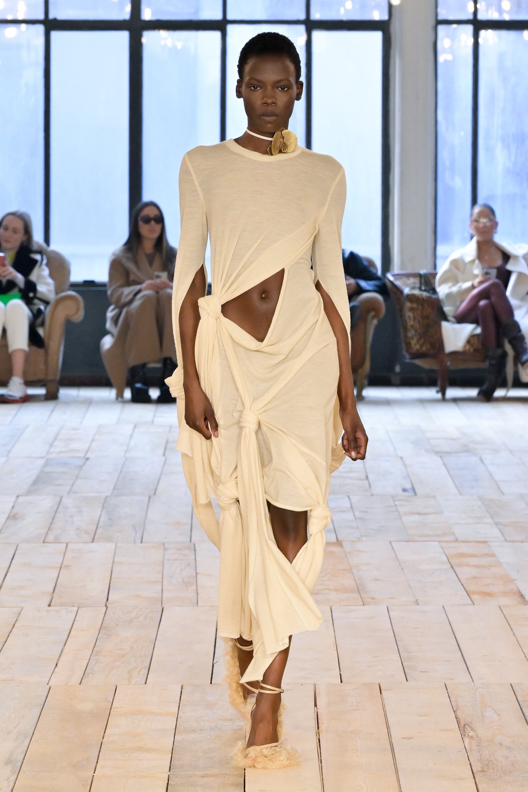 「BARE」は、そのタイトルが示唆するとおり、余分なものを取り除いて本質的要素を剥き出しにすることにより、物事の原点に立ち返るということです。覆い隠しつつさらけ出し、露わにしつつ覆い隠すこと。「BARE」は、根源的な呼び声、残忍なまでにシンプルな力、そして自然の中に見られる曖昧な官能性を称えるコレクションです。デザインには、純粋かつ野性的でありながら同時に、溢れ出るほどに過剰なマスキュリン/フェミニンなエネルギーが満ち、絶対的自由としての両性具有を表現しています。本コレクションは、ピーター・ヒュージャー、ロバート・メイプルソープ、ナン・ゴールディンなどの写真家の作品がインスピレーション源となっています。彼らはいずれも、しばしば陰に隠れた美しさを浮かび上がらせることに専念し、結果として、ハイアートと周辺的人生の間のパワフルな交差点となる作品を生み出しています。彼らのレンズを通して表現される人々は皆、肌と魂をむき出しにするという行為、つまり親密さと露出、魅力と退廃、脆弱性と鎧のような強固さの間の微妙な境界線上を永久に歩き続けるという行為に存在する難解な問題を、擬人化する存在となりました。ピーター・ヒュージャーはかつて、こう言っています。「私が写真に収めるのは、あらゆる極限まで自分を追い込む人たち。私が興味深いと感じる人たちはそういう人たちであり、自分自身でいるための自由に固執する人たちなのです。」この文脈で読み解くと「BARE」とは、単に「裸の状態」や「物事の純粋な状態」を表す言葉ではなく、むしろ、存在の複雑さを正当化することと同義であると言えます。つまり、ありきたりで決まりきったことを演じてみたかと思えば、型破りな行動を取ってみたり、一見奥深くあったかと思えば、非常に表面的であったり、ひとつの道にこだわったかと思えば、さまざまな改革を受け入れてみたり・・・こうした自由な意志があふれる存在の正当化です。何であろうと、裸になるということは、自分の肌に無条件に馴染むということです。自分らしくあるという行為は、それ自体が革命であり、自分の肌を讃えるということは、より一層パワフルな革命なのです。肌、すべての肌、第二の皮膚としての肌、すべてを讃えるのです。コレクションでは、ブルジョワなエレガンス、プリミティブなシックさ、そしてグラマラスな両性具有など、さまざまなコントラストが織りなすゲームのように展開していきます。伝統的なテーラリングを定義付けるのは、大胆なショルダーとワイドパンツ。ズートスーツとテディボーイズの両方をインスピレーションソースとするルックです。膝丈のストレートスカートと大胆なレイヤリングによって、90年代のドレスに見られた時代を超えた本質的な魅力が前面に押し出され、シアーで透明感のあるシルエットが活気を帯びて、ねじれたり回転したりしながら体を包み込みます。カラーパレットは、ニュートラルなスキントーンから、ベージュやキャメル、そしてシナモン、キャラメル、ジンジャーの色調のブラウンまで、幅広く展開。いずれも繊細なピーチで補われ、ときおり入る絶対的なブラックが全体を引き締めます。アクセサリーは、メタルとボタニカルなアクセントの意外な組み合わせによって生命が吹き込まれています。ランウェイショーは、ボロボロのソファが置かれたグランジガレージのような親密な空間が舞台。テオ・テアルドによる音楽「Stelle Disorientate」がショーを盛り上げます。