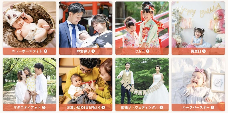 | 納品枚数 | 原則、75枚以上データ納品(ニューボーンフォトのみ40枚以上の納品) ※撮影時の状況または天候等により、当該枚数に達しない場合もあります。 |