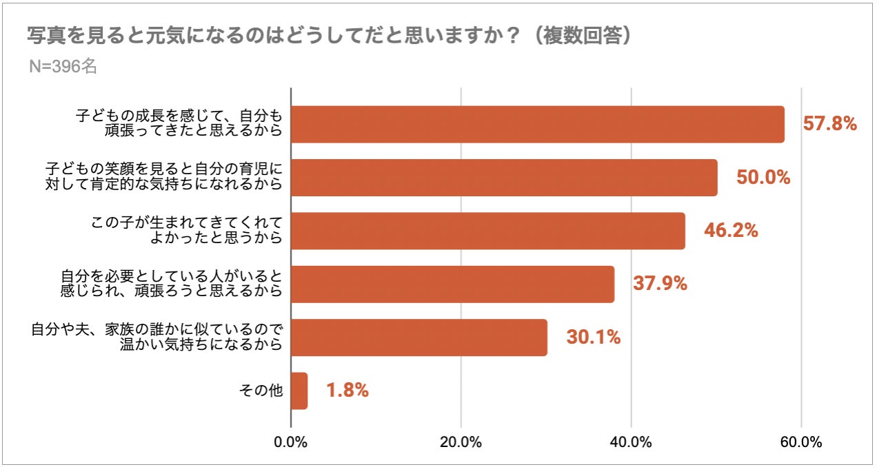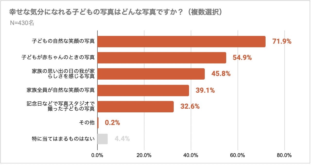 また、具体的に「幸せな気分になれる子どもの写真はどんな写真か」を問うと「子どもの自然な笑顔の写真」(71.9%)で最も多く、次いで「子どもが赤ちゃんのときの写真」(54.9%)、「家族の思い出の日の我が家らしさを感じる写真」(45.8%)が続きました。