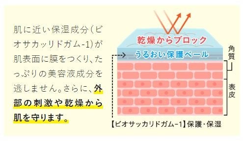 ベタつかずにサラッと軽やかなつけ心地は、イヌリンを高配合することで実現し、るおい保護ヴェールが乾燥をブロックします。肌に近い保湿成分(ビオサカッリドガム-1)が肌表面に膜を作り、たっぷりの美容液成分を逃しません。