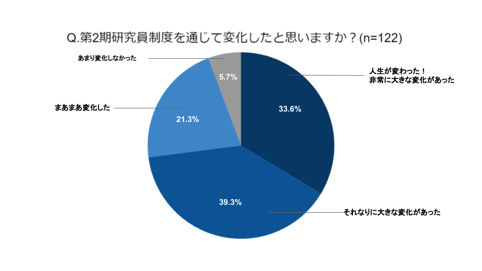 第2期研究員制度の活動を通じて「非常に大きな変化があった」方は33.6%、「それなりに大きな変化があった」方は39.3%、「まあまあ変化」した方は21.3%で、9割以上の方が変化を実感。