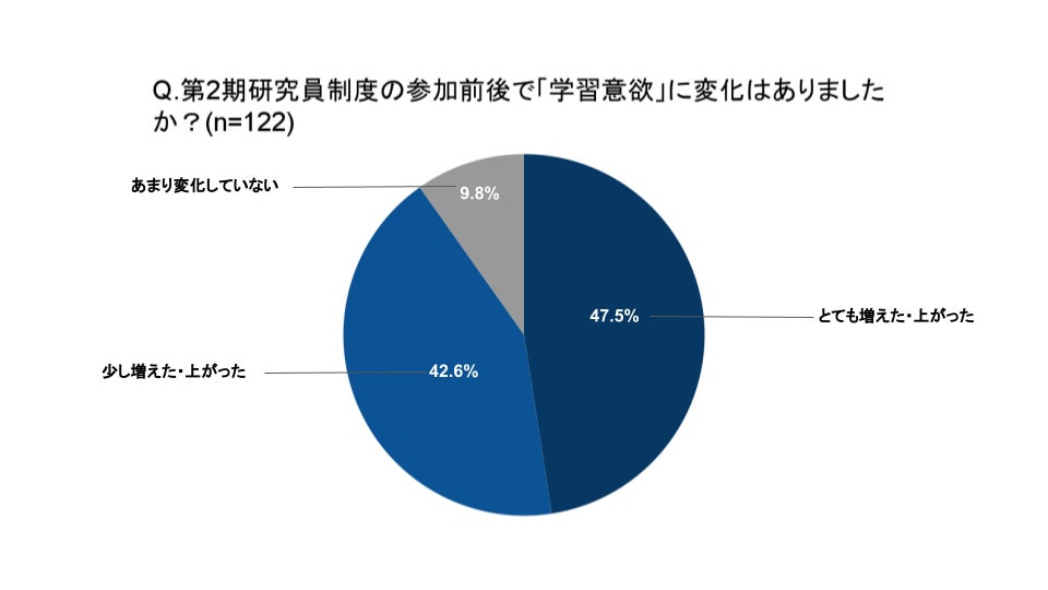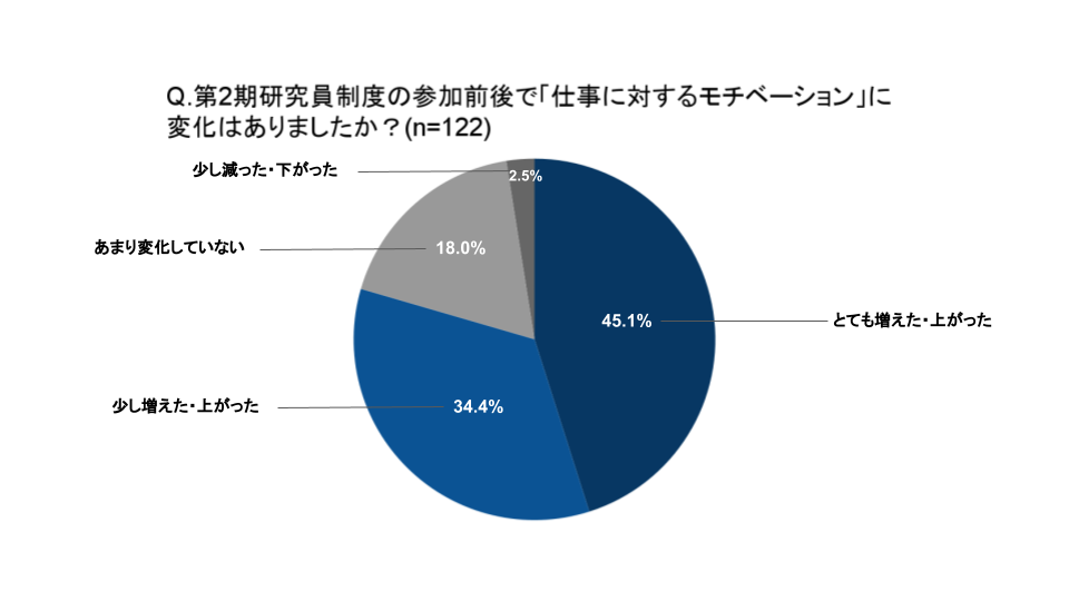 2期生活動後、参加者を対象にしたアンケートでは、研究員制度を通じて「大きな変化があった」「まあまあ変化」したと回答した方は94.2%で9割以上いることが確認でき、その中でも「学習意欲」や「仕事に対するモチベーション」に変化を実感した方が多い結果となりました。