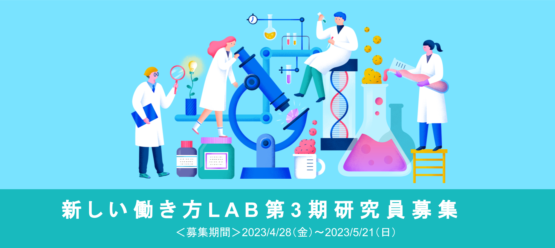 “実験”をコンセプトに、個人やチーム単位で「新しい働き方」を研究・発信する制度です。研究方法は、自分が研究してみたい働き方を自由に企画できる「自主企画」と、企業が指定したお題に参画する「指定企画」があります。研究員は企画を決め、応募し、研究員として選出された方は数カ月間の実証実験を行い、報告書にて成果を発表します。活動期間終了後は「新しい働き方AWARD」と題する表彰式を開催する予定です。