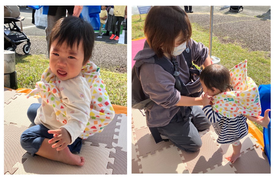 「つよいこ一升もち&栄養相談会」では、健やかな成長を祈る伝統行事“一升餅”をテーマにお餅をビーンスタークのフォローアップミルクつよいこに置き換えて、つよいこ(約1㎏)を背負う体験を行いました。