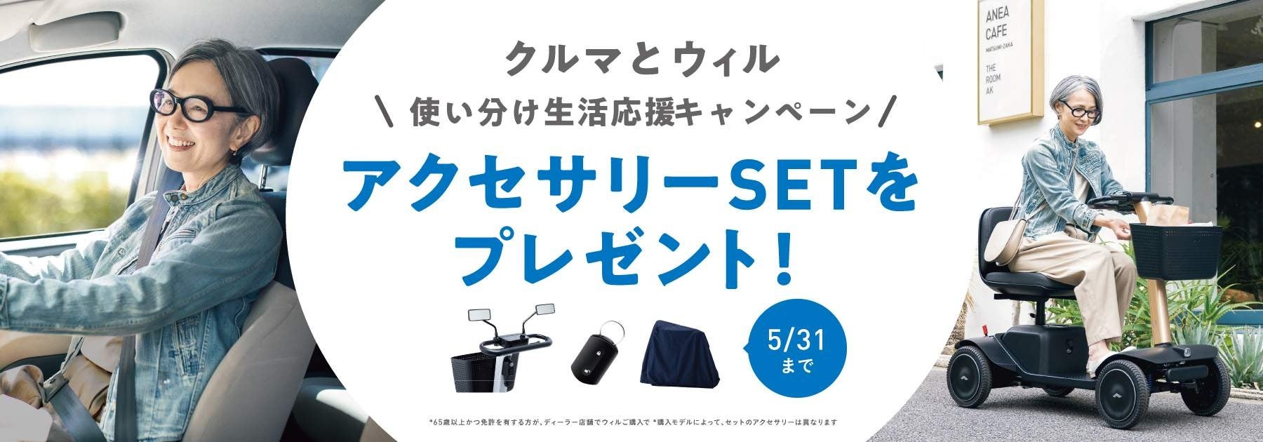 期間中に、車に乗る65歳以上の方が、ウィル取り扱いディーラーでウィルをご購入の場合、購入モデルに該当のアクセサリーセットをプレゼント。 |