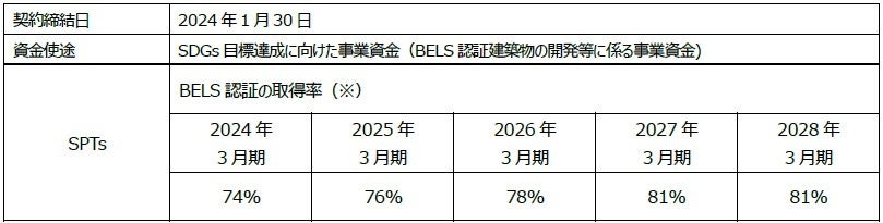 当社が展開する「VORT®」シリーズおよび管理物件は、都心5区を中心に170棟を超えており、建築物省エネルギー性能表示制度 BELS認証(Building-Housing Energy-efficiency Labeling System)を取得した実績は、62棟(2024年1月現在)に上っています。優れた環境性能を有する不動産の形成により、CO2排出量の削減等、環境や社会への配慮に努めています。このたびの「とりぎんサステナビリティ・リンク・ローン」において、当社は下記のようにSPTを設定しました。毎年3月末の会計年度の判定値における達成状況により、鳥取銀行の貸付金利の優遇を条件とするものです。