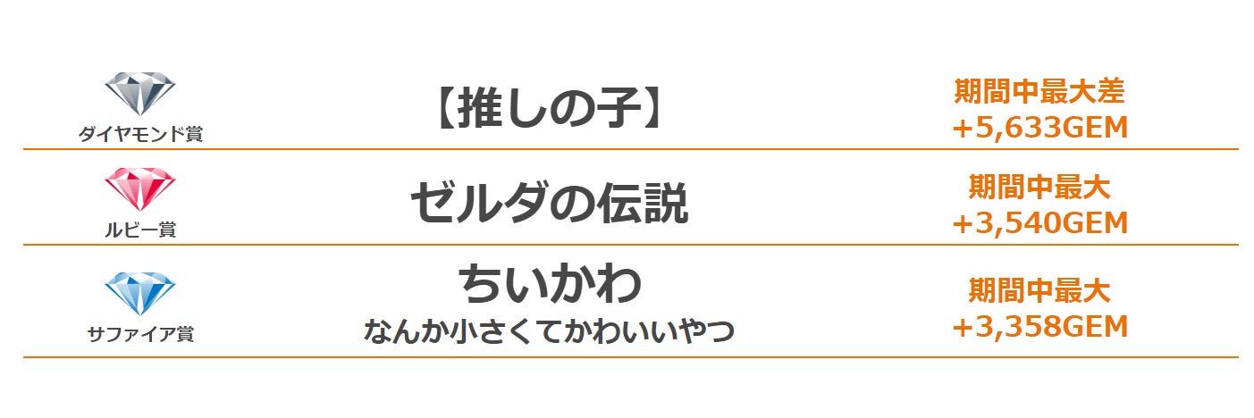 急上昇部門[総合]のダイヤモンド賞に輝いた『【推しの子】』は、前年最大月比+5,633GEMを記録。GEM指数の上昇で2位以下を大きく引き離し、まさに23年を代表する“推し”エンタメブランドとなりました。GEM指数はTVアニメ1期放送の4~6月にかけて大きく上昇しています。この流れを作った要因として、TVアニメ第1話を劇場で先行上映してからテレビ放送(地上波と同時にABEMAで単独先行配信も実施)を行ったほか、マンガも青年コミック誌「週刊ヤングジャンプ」掲載から1週遅れでWebマンガ誌「少年ジャンプ+」で初回無料配信するなど、まさに複数メディアによる仕掛けがブランド価値上昇に貢献したと言えるでしょう。