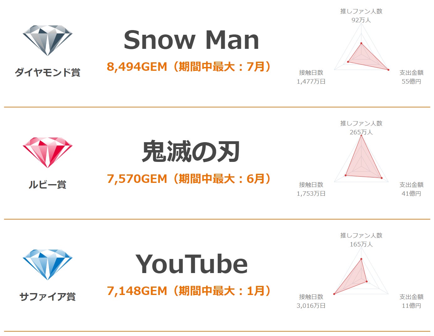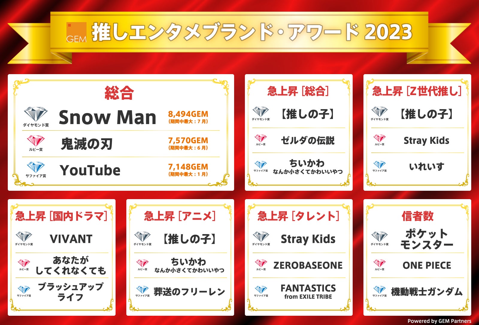 エンタテイメント業界に向けたデータ×デジタルマーケティングサービスを提供するGEM Partners株式会社(ジェムパートナーズ、所在地:東京都港区)は、この度、消費者が“推した”エンタメブランドを讃える「推しエンタメブランド・アワード」を設立し、2023年の受賞結果を発表しました。本アワードでは、“推し”という目に見えないものを、誰が見ても分かりやすい「数値」に置き換え、表彰することで、エンタメブランドのトレンドやヒット状況を広く周知することを目的としています。
