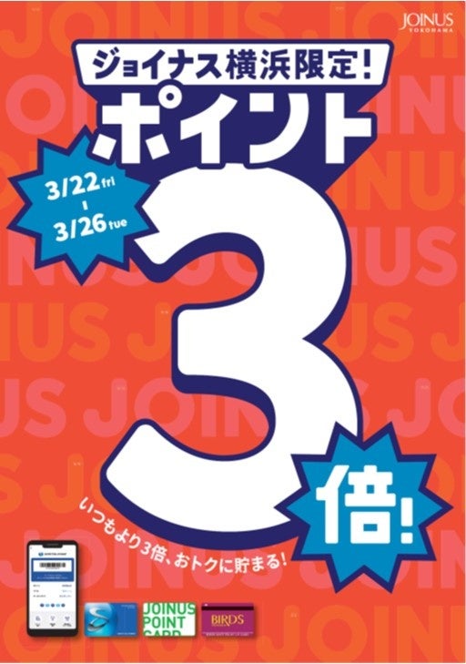 ジョイナスでのお買物・お食事で、通常の3倍のポイントがたまるおトクなキャンペーンを開催いたします。いつもよりおトクなこの期間にぜひジョイナスでのお買い物、お食事をお楽しみください。
