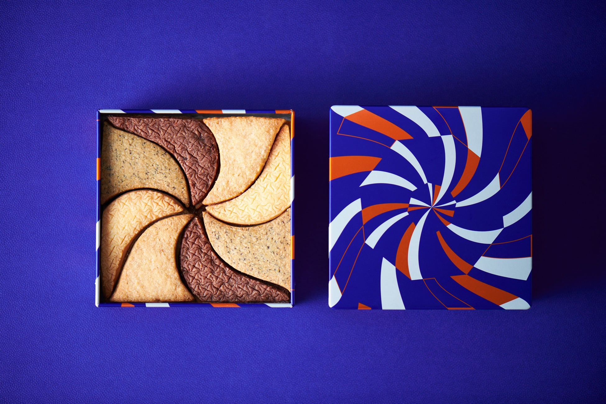 北海道産の小麦粉とバターにこだわった4種のクッキーに、フロランタン、ブールドネージュを詰め合わせたクッキー缶です。4段構造になっており、食べ進めていくワクワク感を演出します。缶のデザインは、ぐるぐると螺旋を感じるグラフィックを全面に施すことで、ブランドのテーマである“没入感”を表現。蓋を開けた瞬間に引きこまれる没入の世界観を、缶のデザインと敷き詰められたクッキーを通してお楽しみください。