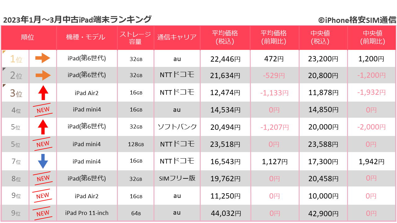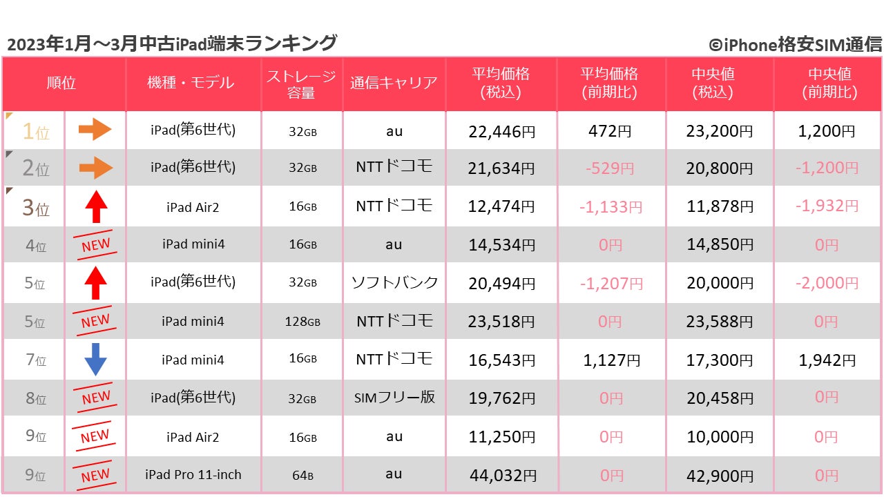 前回の調査(2022年10月〜12月)に続き、iPad(第6世代)が1位を維持する結果となりました。しかし、取引数自体はわずかに減少しています。一方で、iPad mini 4は、取引数が増加。15,000円〜20,000円前後で購入可能と手頃な価格にも関わらず、コンパクトで軽いため持ち運びしやすく、ネットサーフィンはもちろん、動画視聴や電子書籍の利用を充分に楽しめるスペックが評価されています。しかし、2022年時点でサポートが終了しているため、今後の取引数にどう影響していくか注視する必要があります。iPadランキング全体を通じては、iPhoneのトレンド同様に、機能性と価格のバランスが良いモデルに人気が集まる結果となりました。