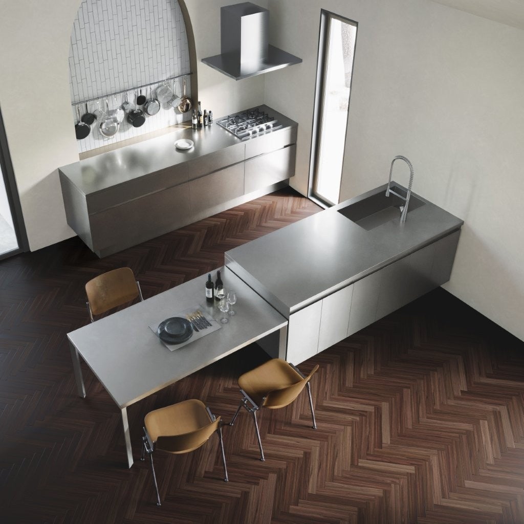 《グラッド45》のキッチンとデザインを統一させたステンレス製※のテーブルです。《グラッド45》と横並びに設置することで、統一感のあるダイニング空間を演出できます。テーブルは独立しているため、必要に応じて配置換えも可能です。キッチン本体の奥行きとテーブルの幅を合わせれば、より一体感のあるダイニング空間に仕上がります。