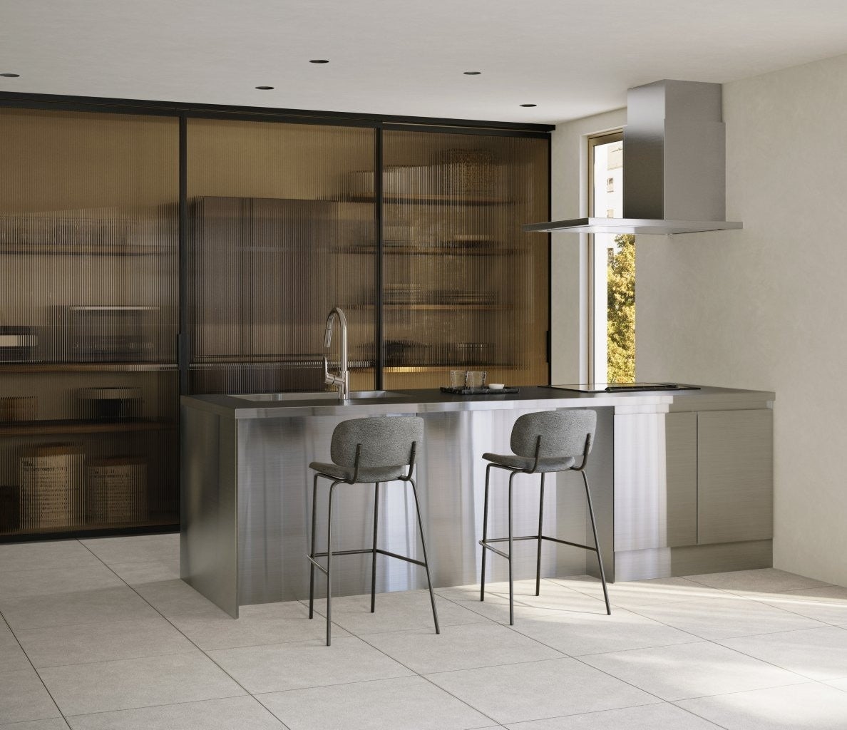 2013年に発売した《グラッド45》は、金属の溶接技術や職人技を詰め込んだ当社オリジナルキッチンです。ステンレスを全面※に採用し、一切の無駄を削ぎ落としたデザインに仕上げることで、素材の美しさを引き立てました。扉やサイドパネルには小口が見えない”留め加工”を施すなど、細部にまで配慮することでスッキリとしたイメージを徹底。オーダーキッチンのような理想のキッチンを実現させるシリーズです。