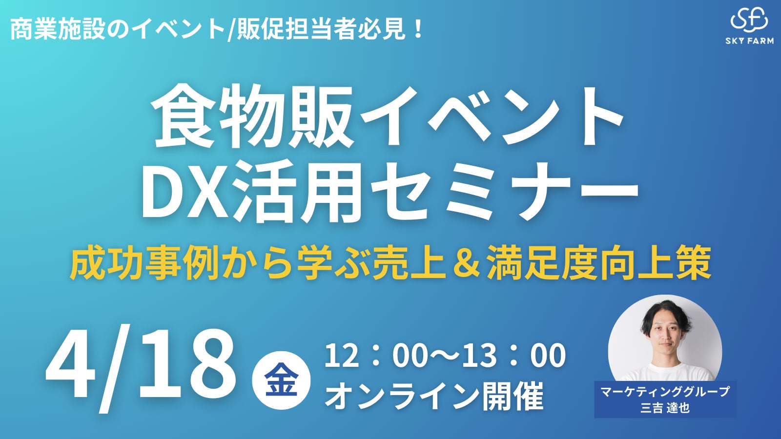 施設特化型モバイルオーダーシステムをはじめ商業施設DXの伴走支援を手がけるスカイファーム株式会社(本社:神奈川県横浜市 代表取締役:木村 拓也)は、商業施設の食物販イベントにおけるDX活用術を紹介するオンラインセミナーを開催いたします。