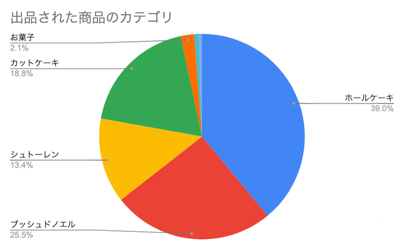 過去のクリスマスレスキュー大作戦での出品商品割合としては、ホールケーキ、ブッシュドノエル、カットケーキなどのケーキ類が最も出品割合として大きく、次いでシュトーレン、その他菓子、惣菜類となっています。