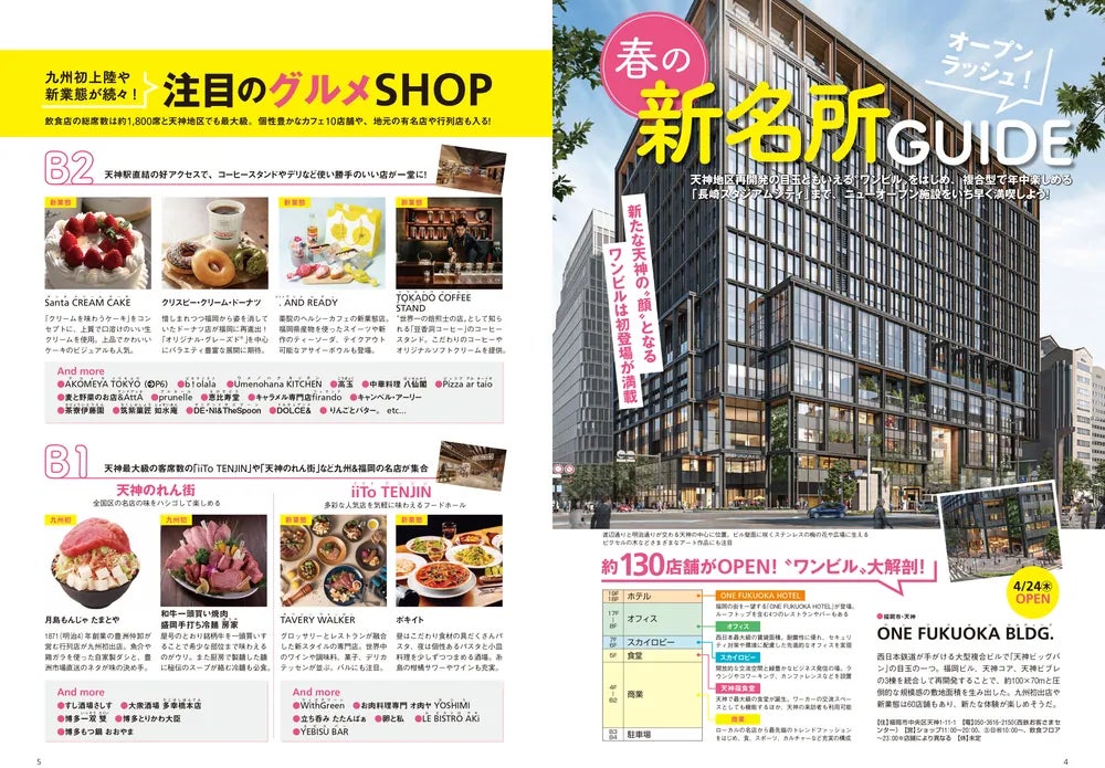 巻頭特集「春の新名所GUIDE」は、福岡市・天神地区再開発の目玉といえるを大解剖。そのほか、大型複合施設「長崎スタジアムシティ」や、話題の飲食店やホテルが入った「ヒューリックスクエア福岡天神」など、街の最新情報を詳細にリポートします。