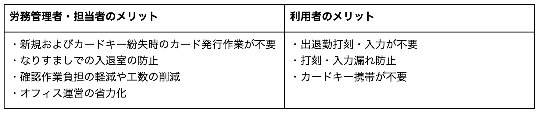 ・新規およびカードキー紛失時のカード発行作業が不要 ・なりすましでの入退室の防止 ・確認作業負担の軽減や工数の削減 ・オフィス運営の省力化 | ・出退勤打刻・入力が不要 ・打刻・入力漏れ防止 ・カードキー携帯が不要 |
