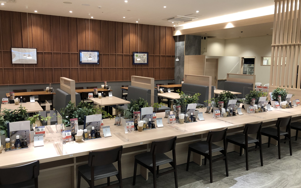 客席はカウンターが14席、テーブル席が60席。和テイストで落ち着いた雰囲気の店内はゆっくりとくつろぎながらお食事が楽しめます。また、全席タブレット端末によるセルフオーダーシステムやクレジットカード決済可能なセルフレジを導入しておりお客様と従業員の安心・安全の為、対面サービスをできる限り少なくしております。