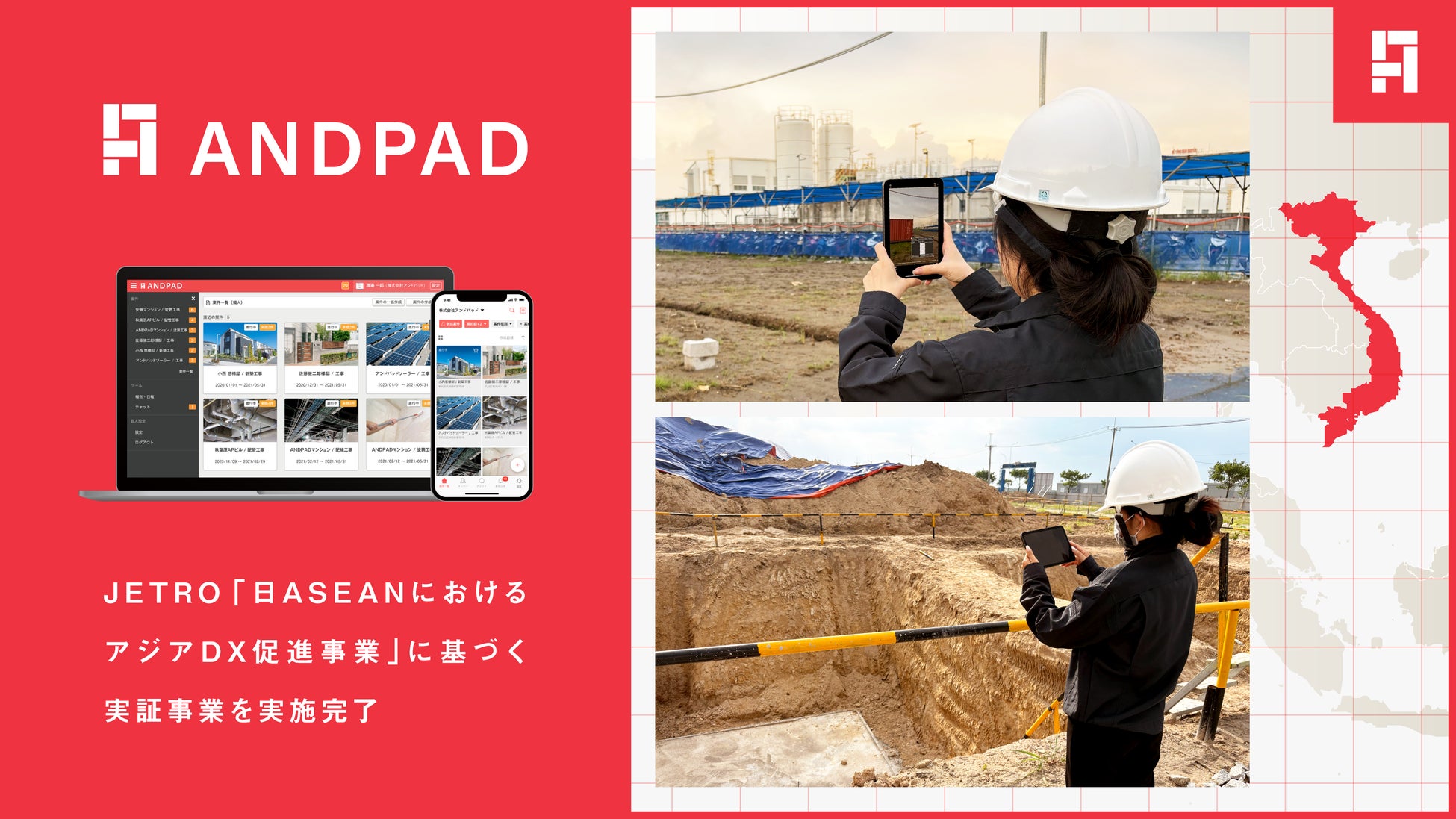 クラウド型建設プロジェクト管理サービス「ANDPAD」を運営する株式会社アンドパッド(本社:東京都千代田区、代表取締役:稲田武夫、以下アンドパッド)とベトナム現地法人 ANDPAD VIETNAM COMPANY LIMITED は、独立行政法人日本貿易振興機構(以下、JETRO)が事業実施事務局を担う「日ASEANにおけるアジアDX促進事業」において採択された「ベトナムの建設産業における業務効率化を目的とした建設プロジェクト管理サービスの開発・導入実証事業」が完了したことをお知らせいたします。
