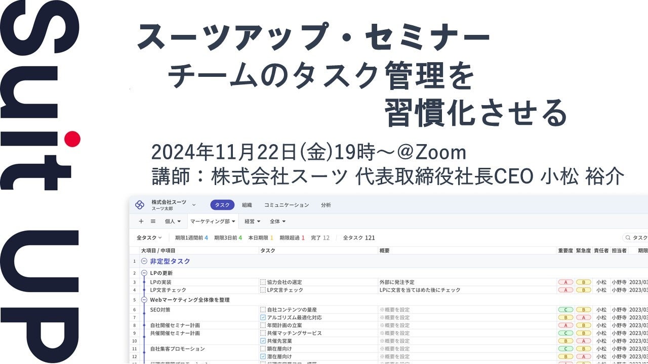 株式会社スーツ(所在地:東京都千代田区、代表取締役社長CEO:小松 裕介)は、2024年11月22日(金)19時から、当社代表の小松が講師を務めるスーツアップ・セミナー「チームのタスク管理を習慣化させる」を無料開催します。
