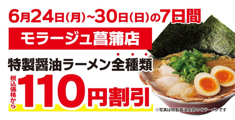 この度オープンを記念して、「モラージュ菖蒲店」にご来店いただいたお客様には、『特製醤油ラーメン全種類』を税込価格から110円割引で販売いたします。
