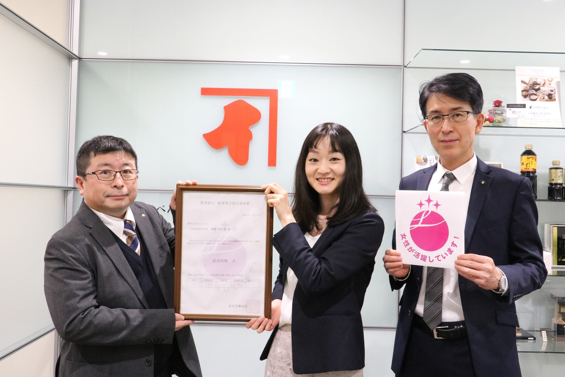 株式会社にんべん(東京都中央区、代表取締役社長 髙津伊兵衛)は、「女性の職業生活における活躍の推進に関する法律(略:女性活躍推進法)」に基づき「えるぼし認定」三ツ星を取得。にんべんは、今後も行動計画に基づき様々な女性従業員の職業生活における活躍を推進していきます。