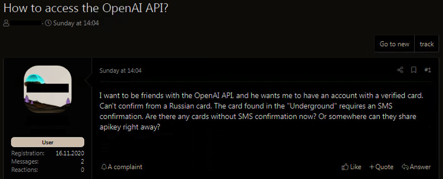 1) ロシアのサイバー犯罪者がOpenAIのAPIへのアクセスを求め、盗品の支払用カードをOpenAIのユーザーアップグレードに使用する最善の方法を尋ねています